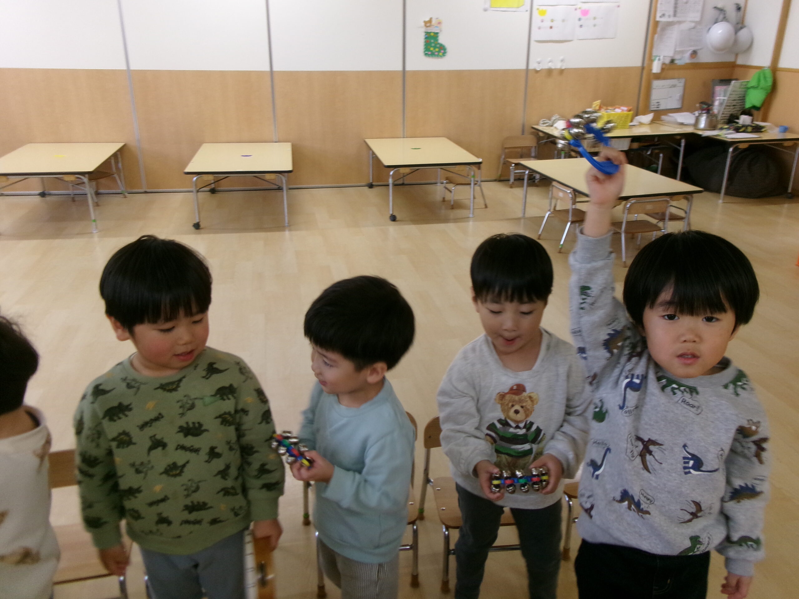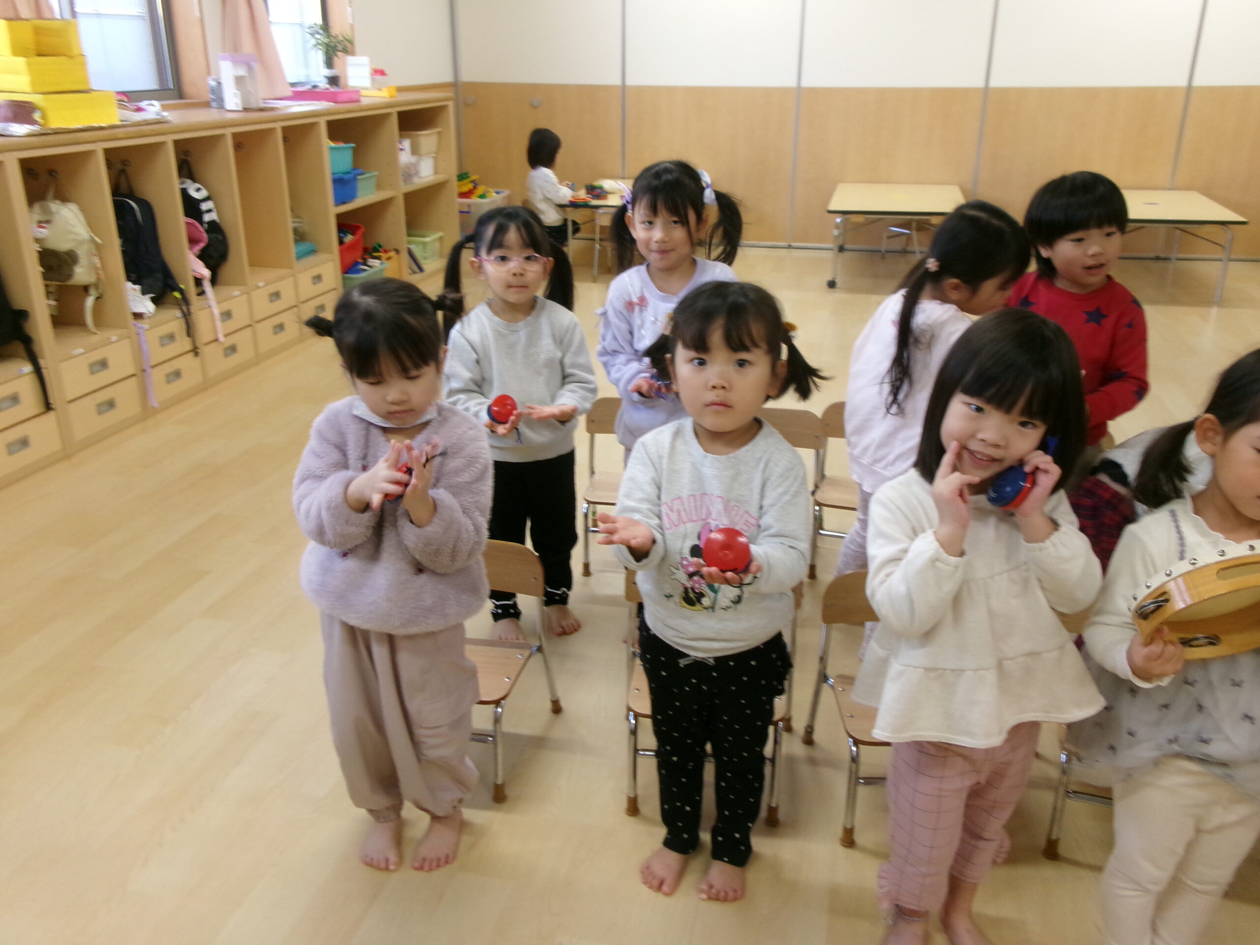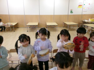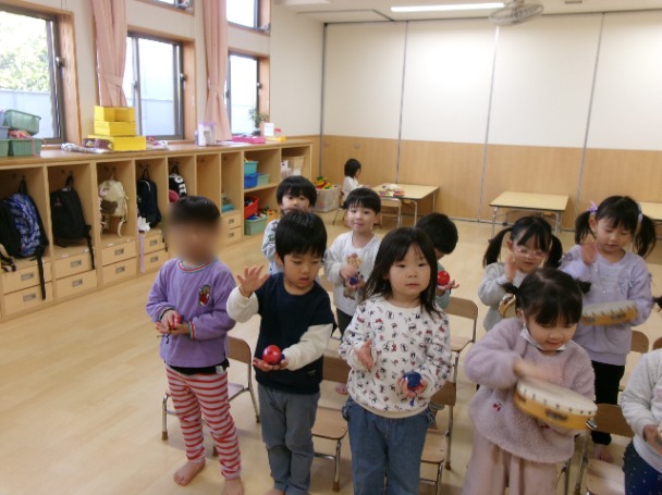 緊張しながらも、お家の方に観てもらうことを楽しみにして最後まで頑張った発表会。終わった後も「楽器したい!」と子ども達からのリクエストで、楽器遊びを楽しんでいます。発表会の時とは違う楽器を持って、山の音楽家♪の合奏に挑戦。違うパートでしたが、みんなリズムが合っていて、上手な合奏に驚きました。その後も、好きな楽器を持ちクリスマスソング♪で楽器遊びを楽しみました。
