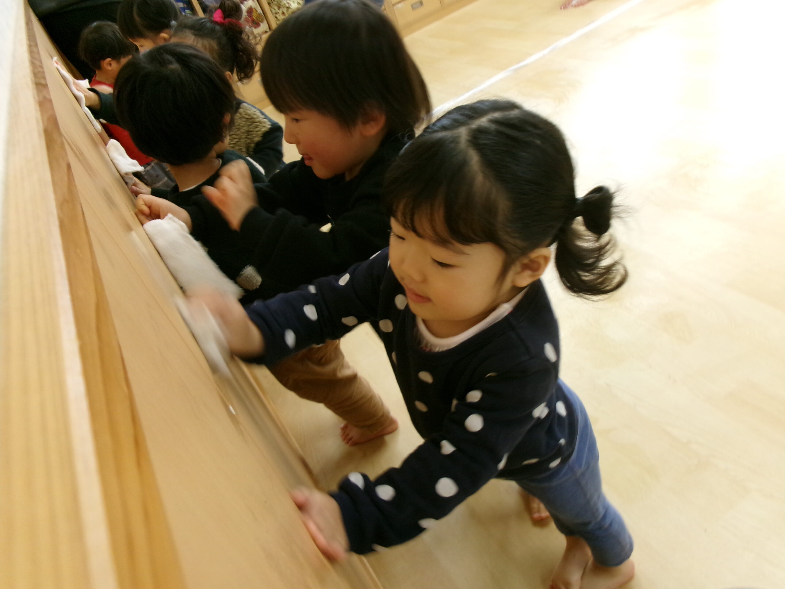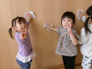 2025年最後の保育園の日。毎日過ごしているお部屋を、みんなできれいにしました。雑巾がけレースをしたり、ロッカーや壁も雑巾で拭いたり、、、。「ピカピカになったかな?」と話しながらお部屋をきれいに大掃除しました。