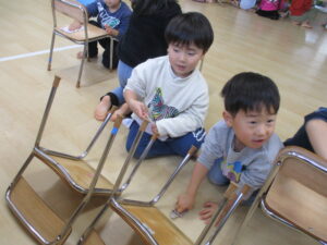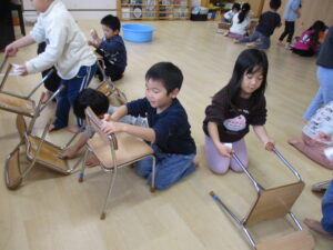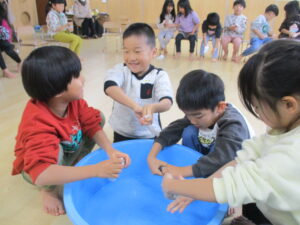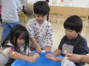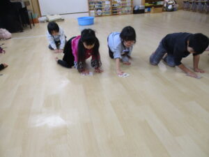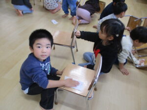 2025年最後の日に、みんなで大掃除をしました。使ってきたイスや、ロッカーなどを「1年間ありがとう!」の気持ちを込めて拭くと、ピカピカになりました。今は、水にぬらしたぞうきんを絞るという経験が少なくなっていて、初めはうまく絞れない子どもも多かったのですが、ぞうきんの持ち方、力の入れ方を伝え何度かしているううちに、しっかり絞れるようになっていました。