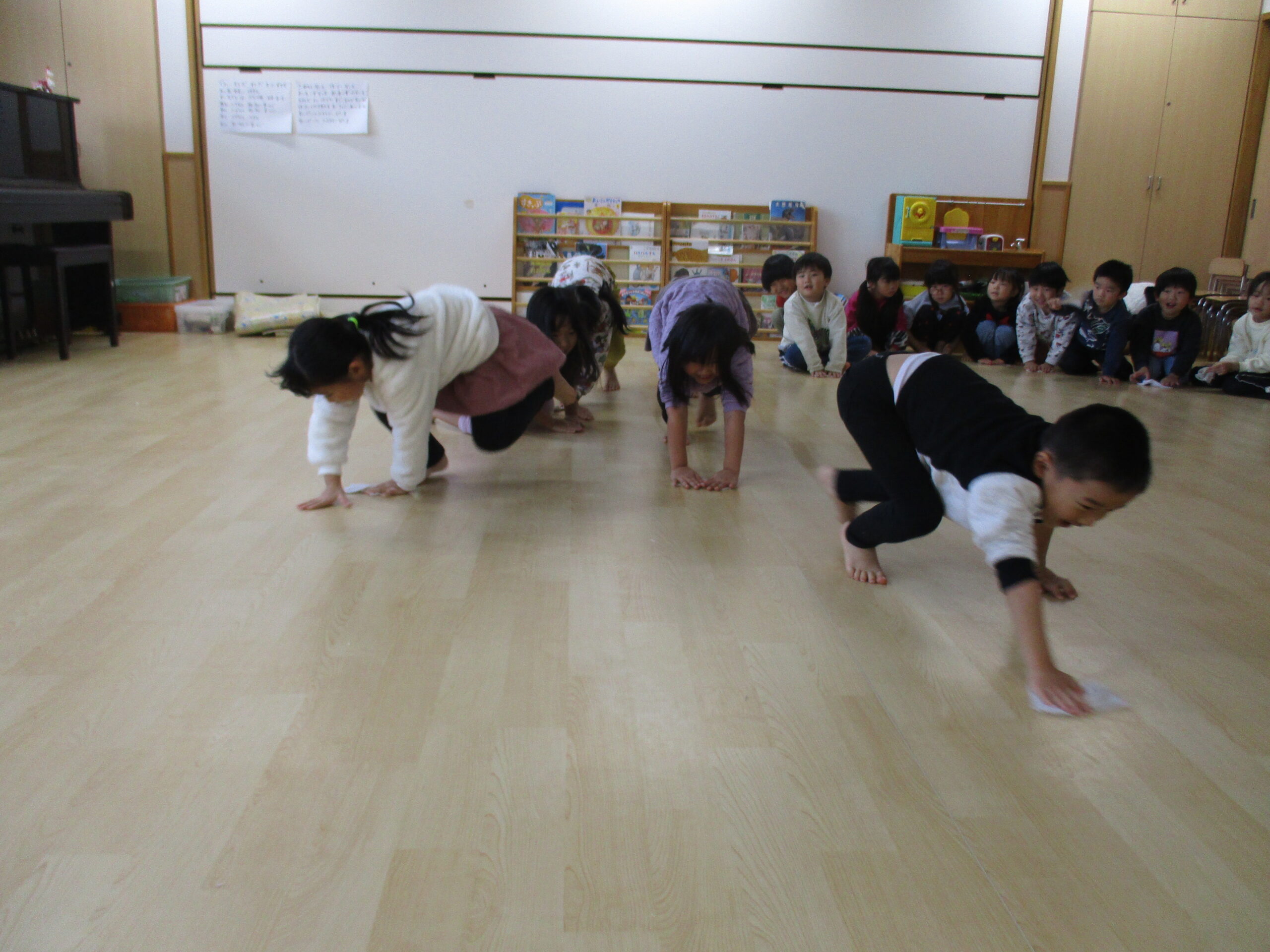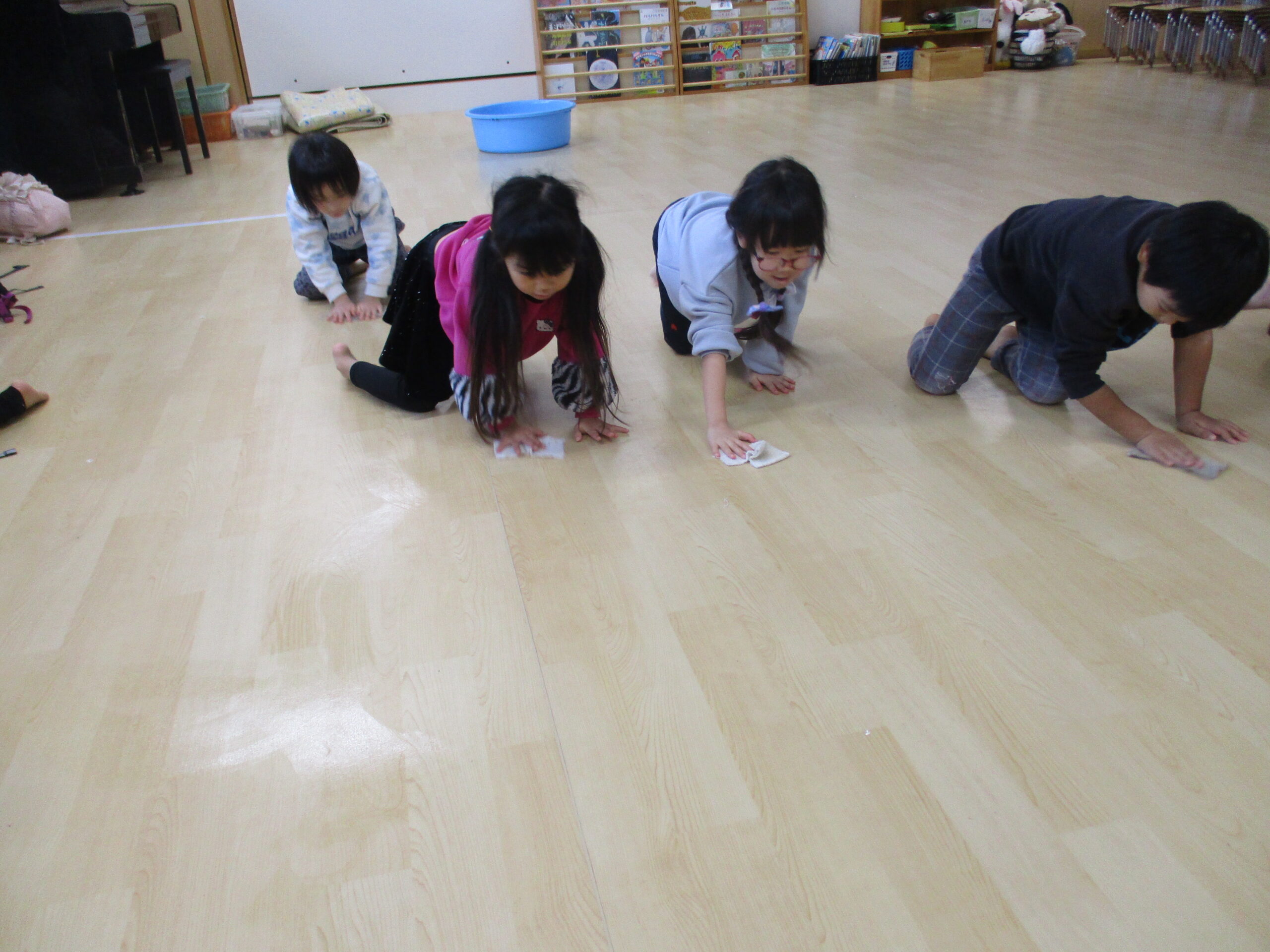 床のぞうきんがけでは『ぞうきんがけリレー』をしながら、楽しく拭くことができました。