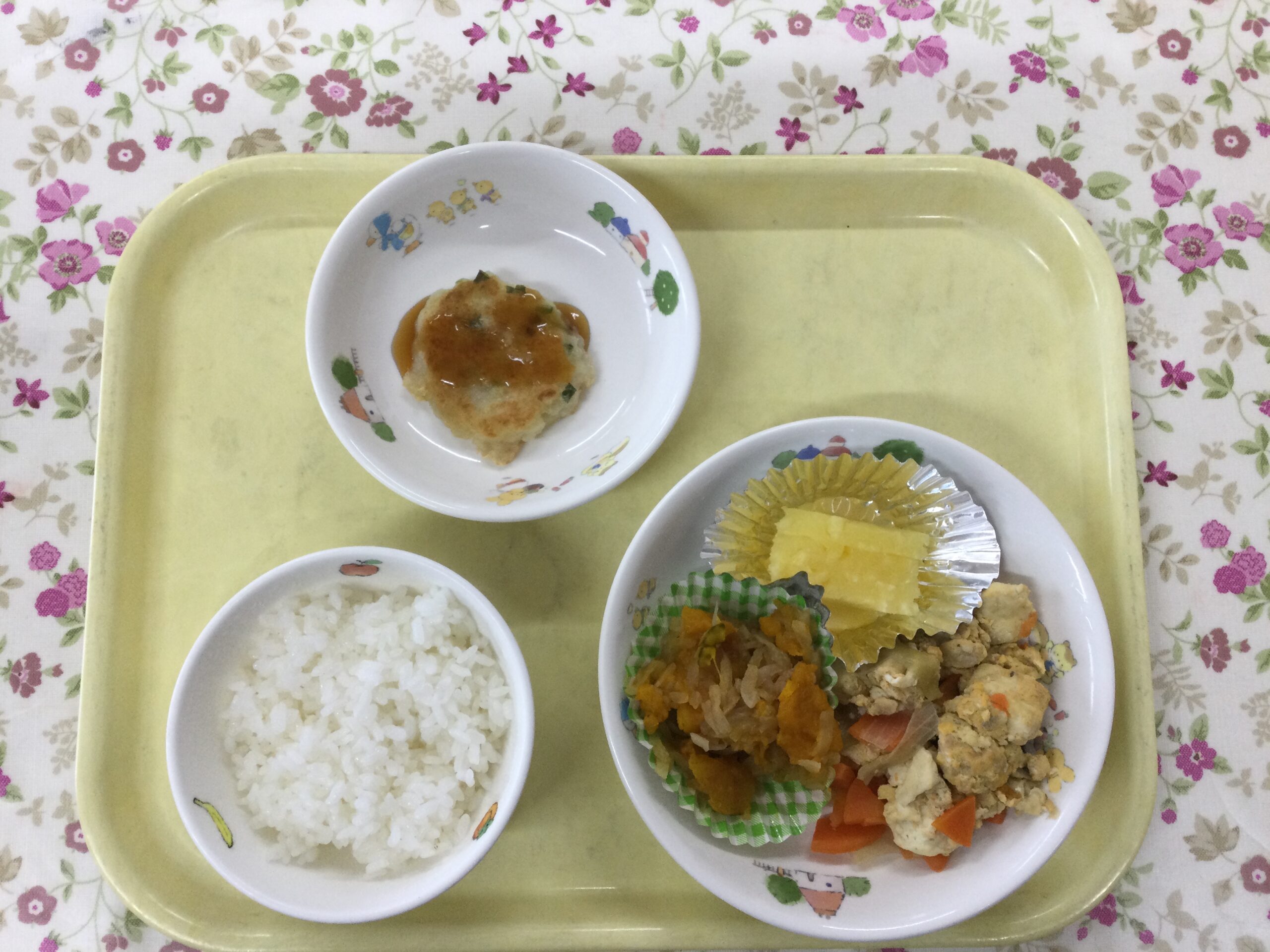 ごはん、豆腐とツナの炒り卵、かぼちゃ煮、パイン缶