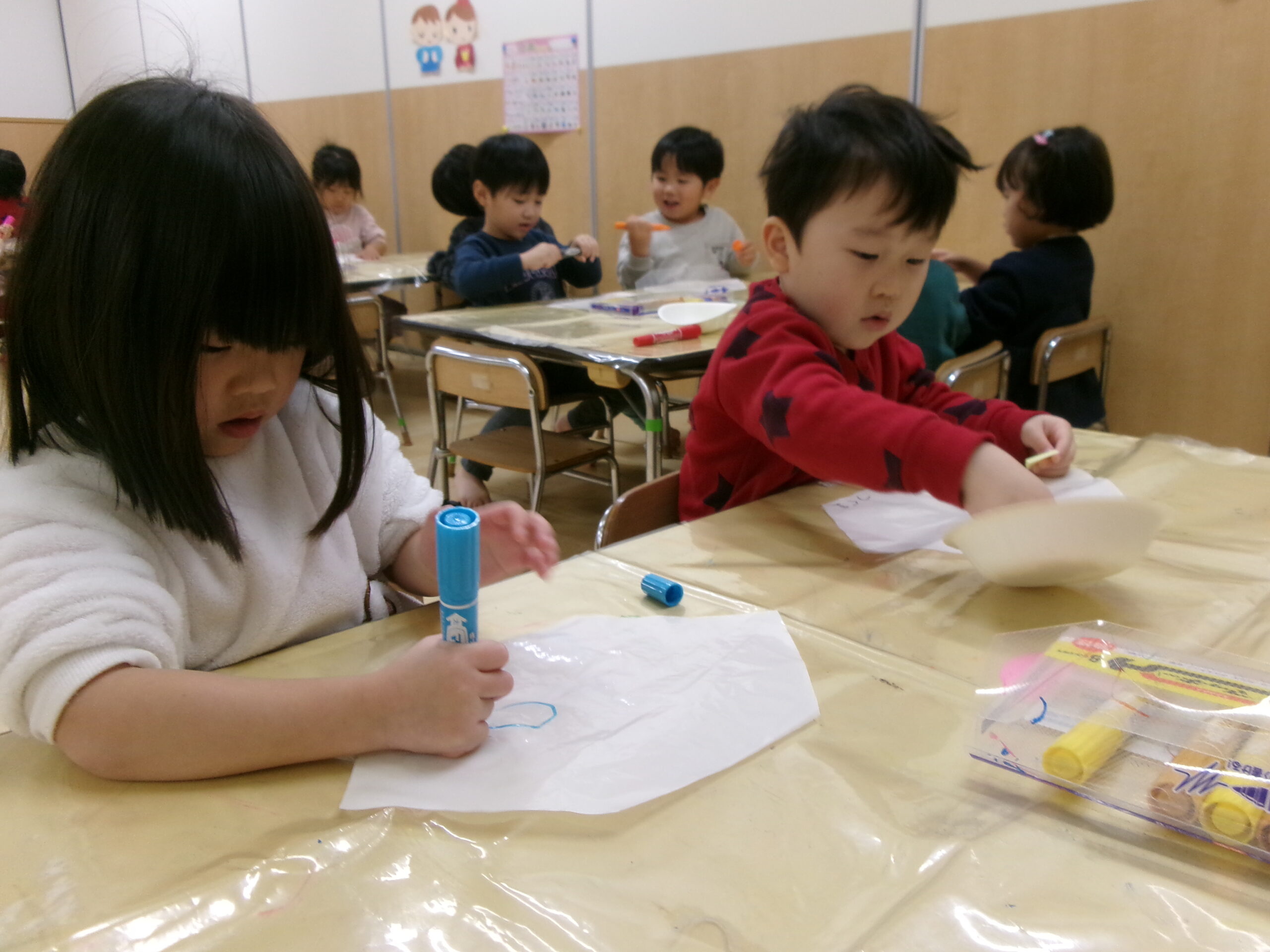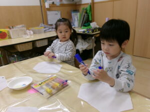 イメージしたものを描いたり、興味を持ってきている文字を書いたりして、自分だけの凧を作りました。