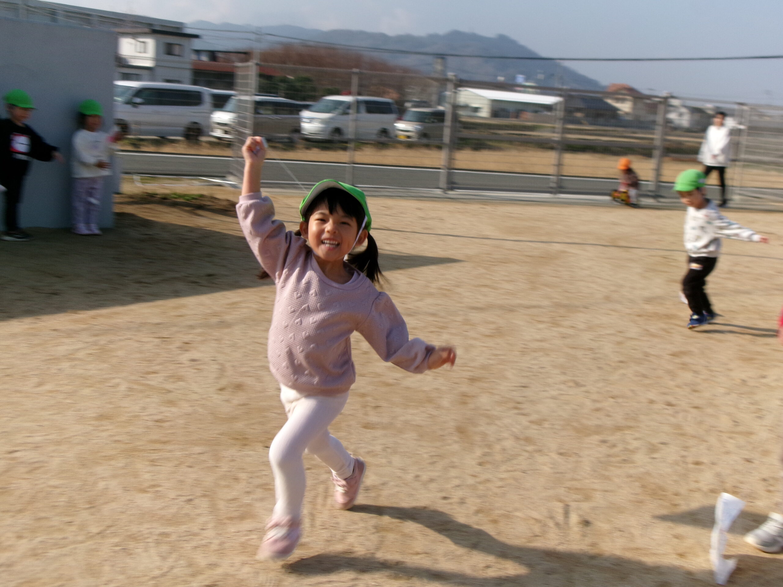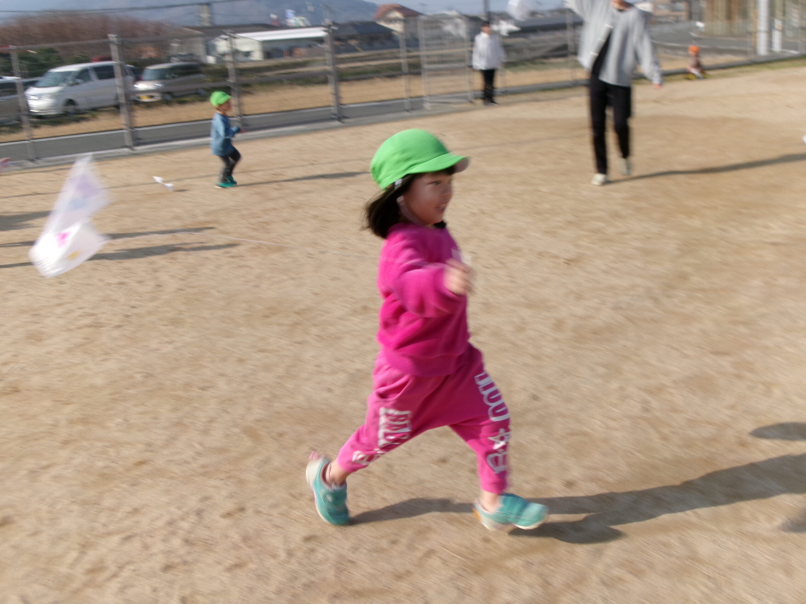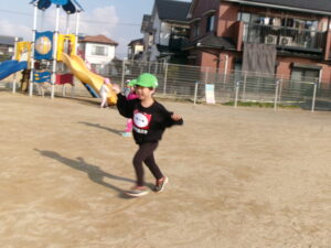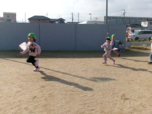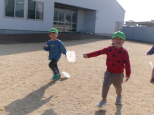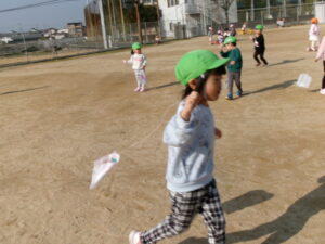 天気が良い日に園庭に出て、凧あげを楽しみました。手を高くあげて思い切り走ると、風を受けて凧が上がり「見て~!」と嬉しそうな様子が見られました。たくさん走って体もポカポカになりました。