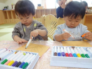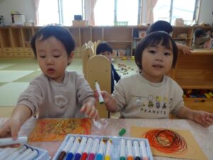 画用紙いっぱいにお絵描きをしてオニの角に。自分で好きな色のマーカーを取って、キャップを外し色を楽しみながらたくさん描きました。