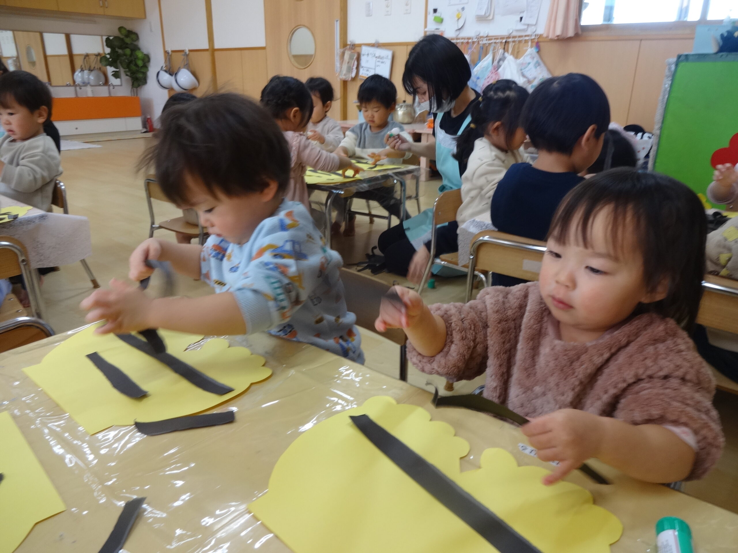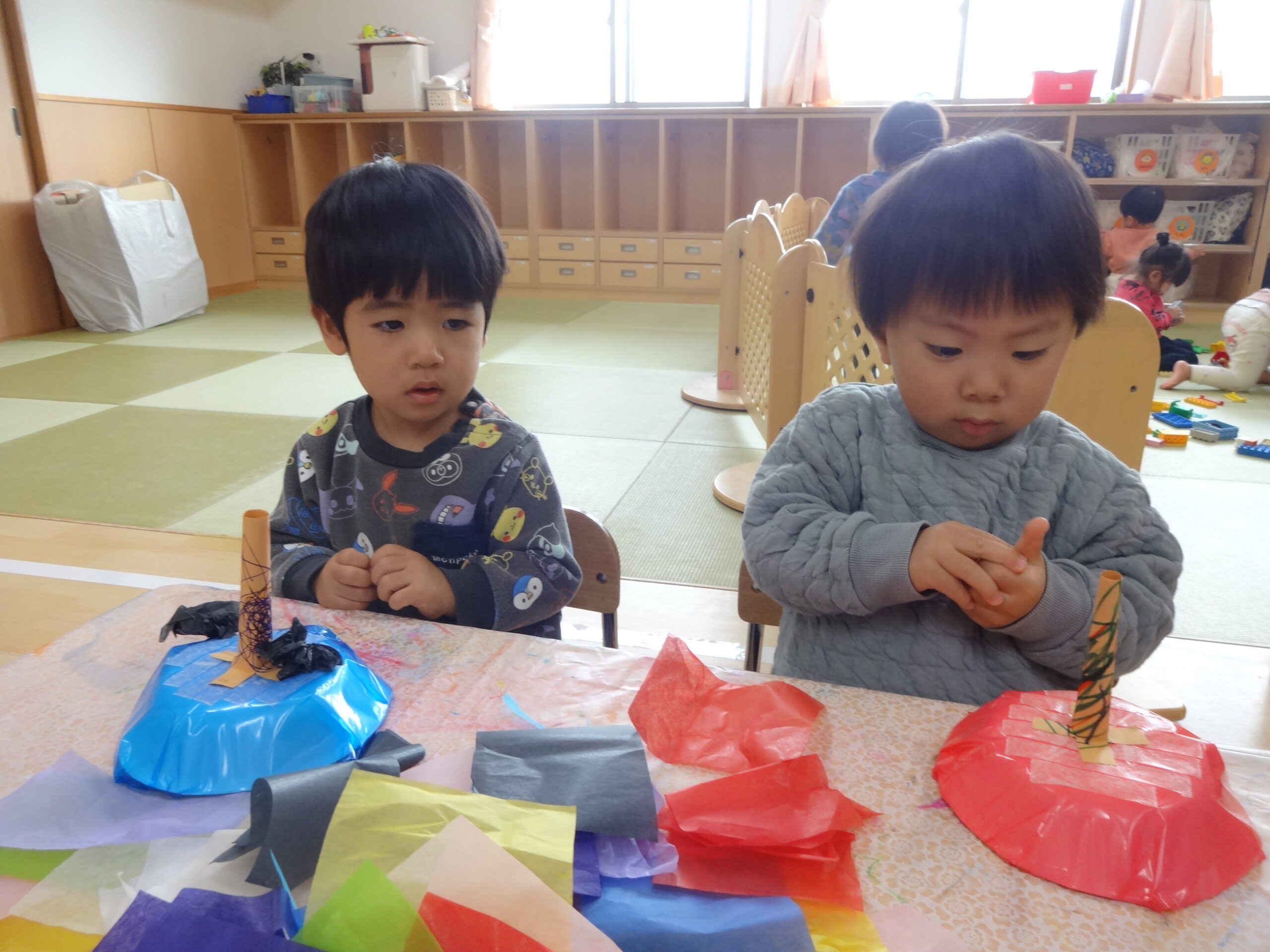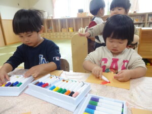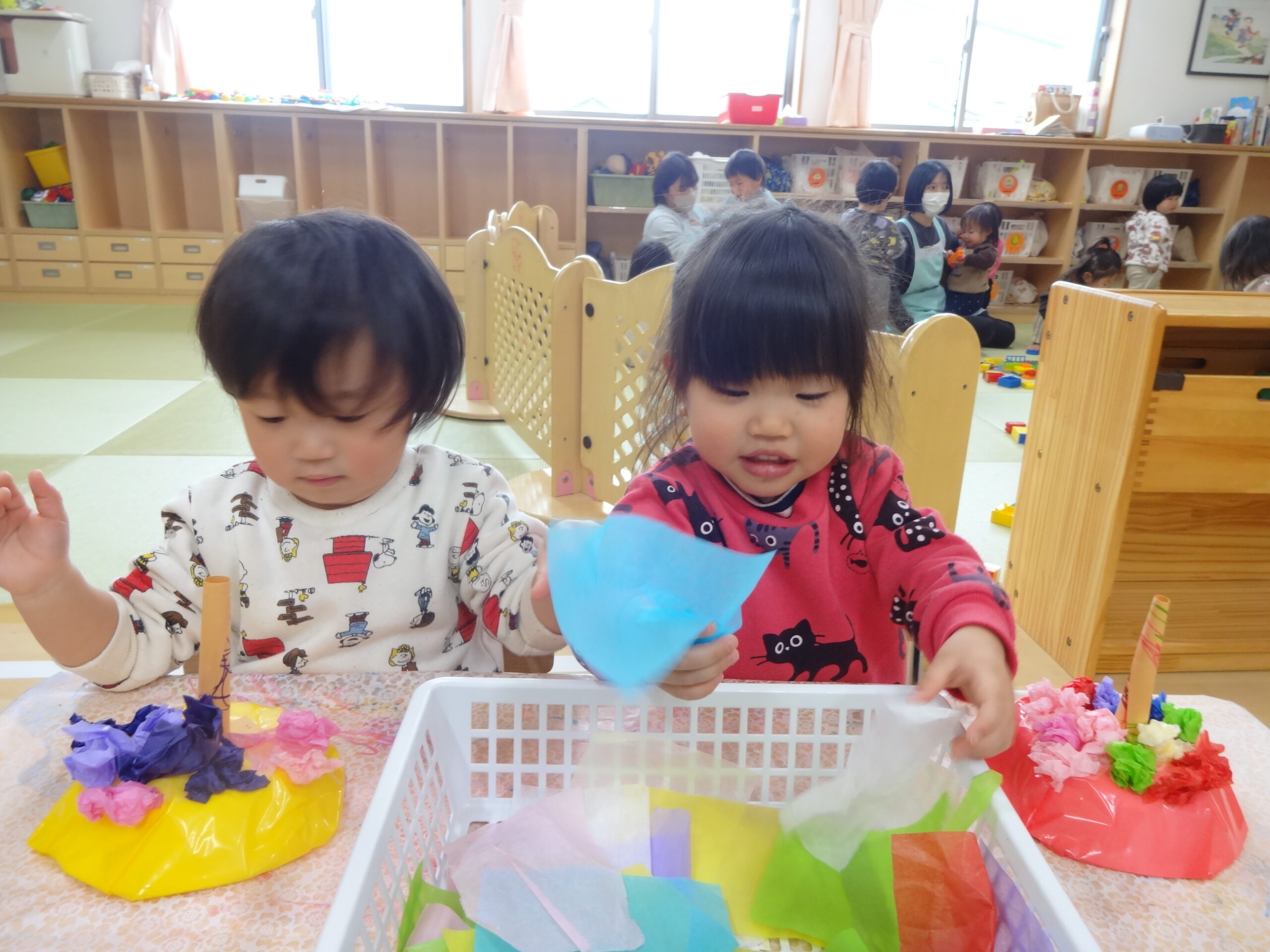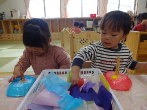 子ども達が好きな色の帽子を選び、お花紙で髪の毛にしました。「ピンク~‼」と、全部ピンク色にしたり『どの色にしようかなぁ。』と悩んでいる表情も可愛かったです。