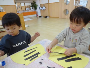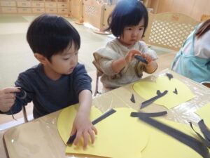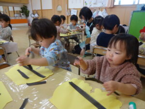 「オニのパンツを作ろうね~。」と保育士の声掛けでスタートしたパンツ作り。自分達で画用紙を破ったり、ちぎって貼ったりと、手先がとても器用になった子ども達です。