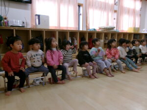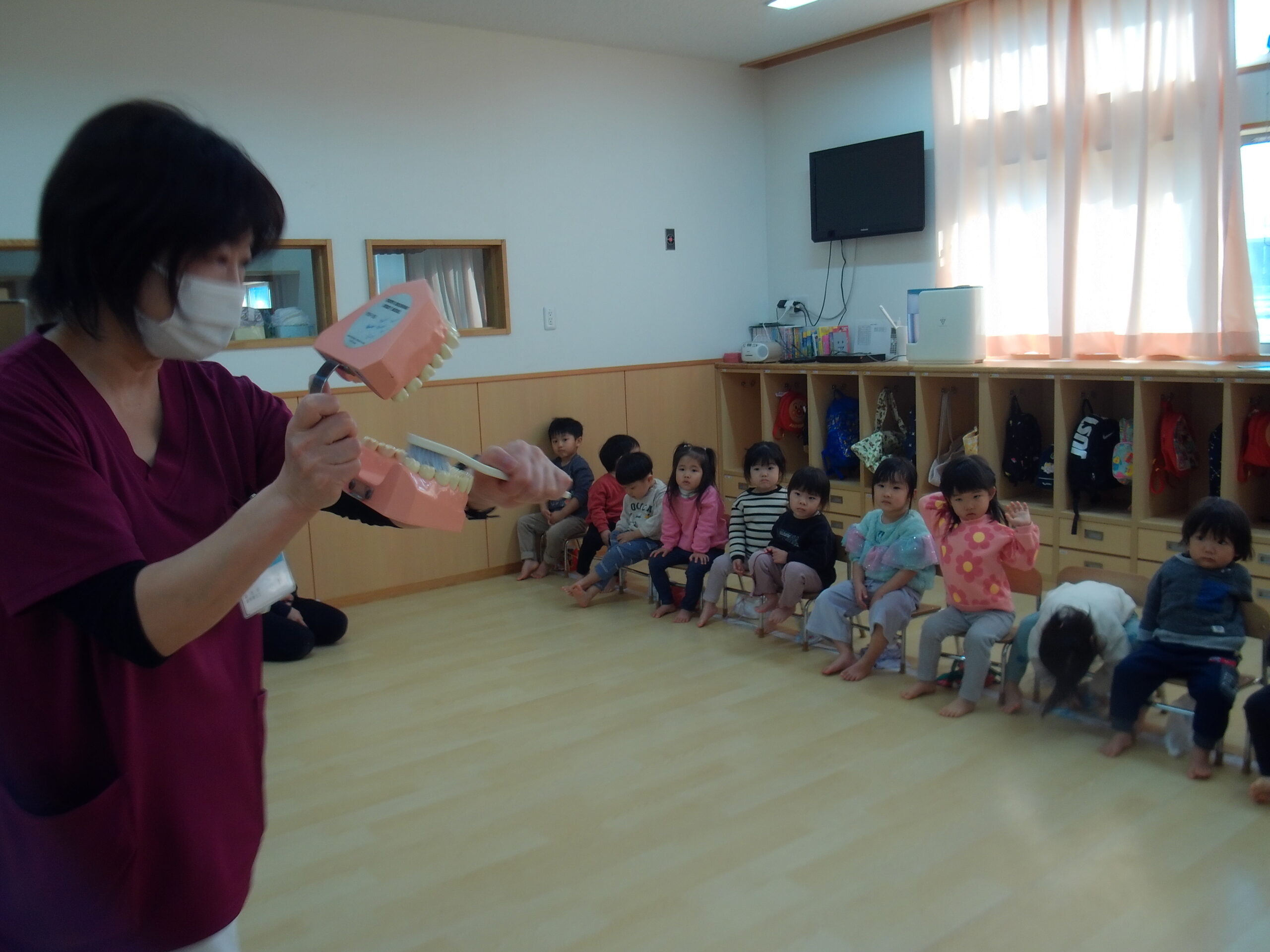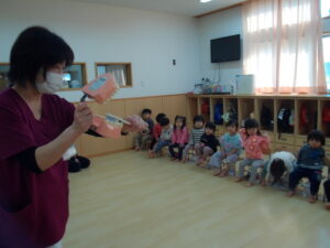もも組の2歳児さんは、初めて歯ブラシを使った歯みがき指導に参加しました。初めに大きく口を開けたり、ほっぺを膨らませたりする『お口の体操』をしてから、歯ブラシを持ちます。磨くときの歯ブラシの持ち方や「歯ブラシを口に入れたまま歩くのは絶対にダメ!」といった大切な約束をしっかりと教えてもらいました。歯科衛生士さんの口の動きや、言葉をよく聞いて歯を磨く子ども達。「こうかな?」という表情をしながら一生懸命みがいていました。
