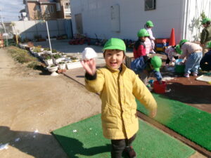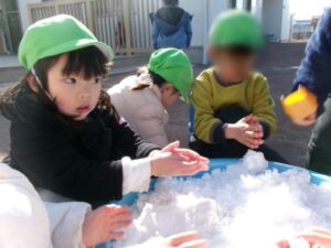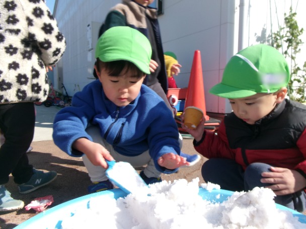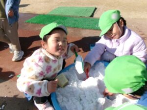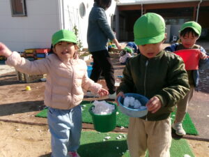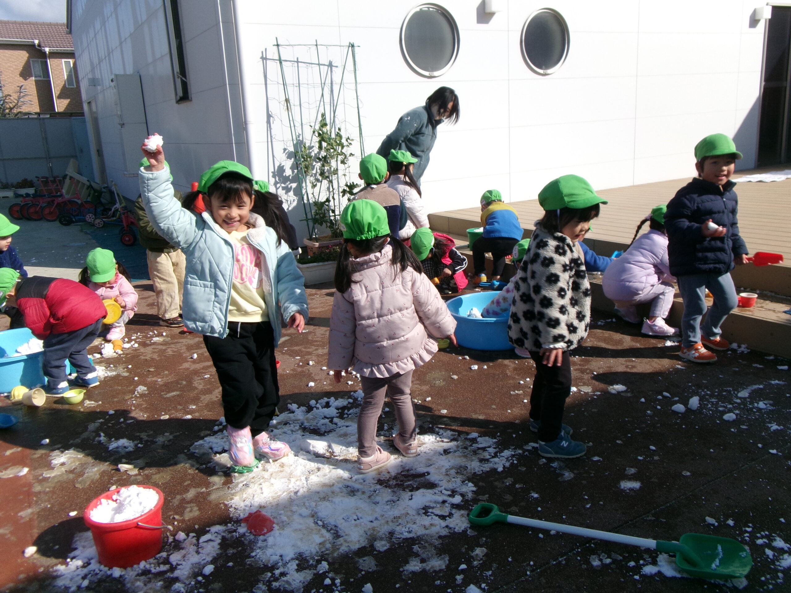 前の日からとても寒くて『雪が降るかも…。』と話していた次の日の朝、沢山の雪がウッドデッキに積もっていたので、みんなで雪遊びをしました。最初は、手で雪を触り「冷たい!」や「ふわふわ」などと、感触を楽しみました。少しずつ雪の冷たさに慣れてくると、丸めて雪玉を作ったりバケツ一杯に入れたりと色々な遊びを自分達で考えていました。