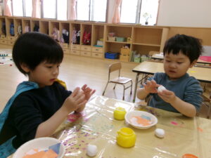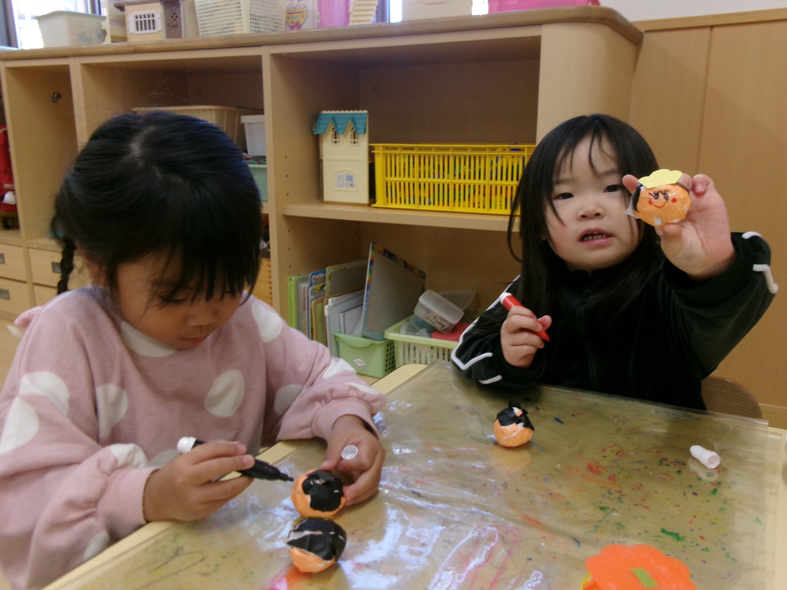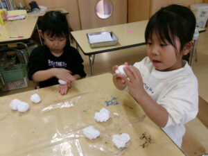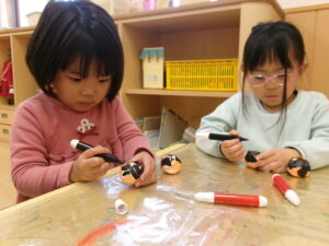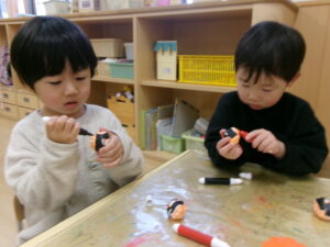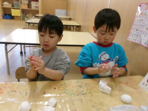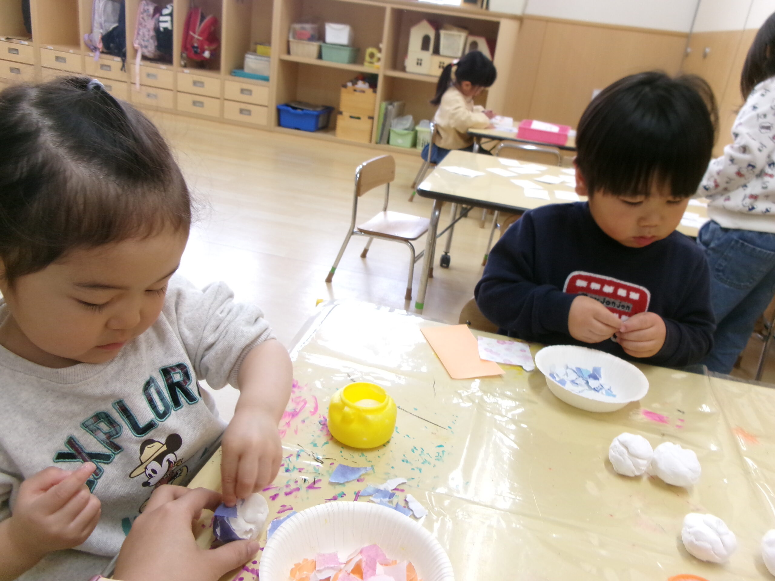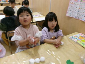 ひな人形制作を行いました。紙粘土の感触を楽しみながら、丸めてお団子の形を作り、それに折り紙を貼って作りました。丸い形に折り紙を貼っていくのは少し難しかったけど、難しい事にもチャレンジできるかっこいいたんぽぽ組さん。「できたよ~!」と嬉しそうに見せくれる姿もありました。作ったひな人形を保育室に飾ると「あ!あれ私の。」「僕のもあった!」と、興味深く眺めていました。