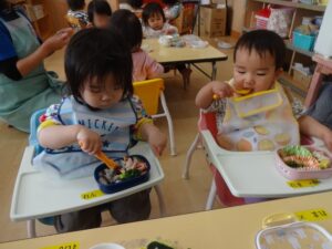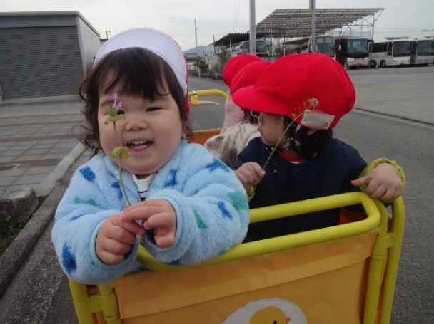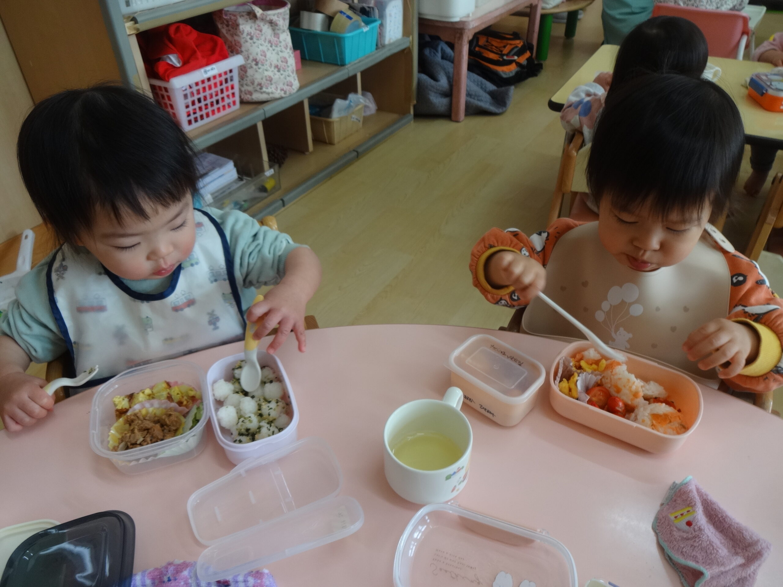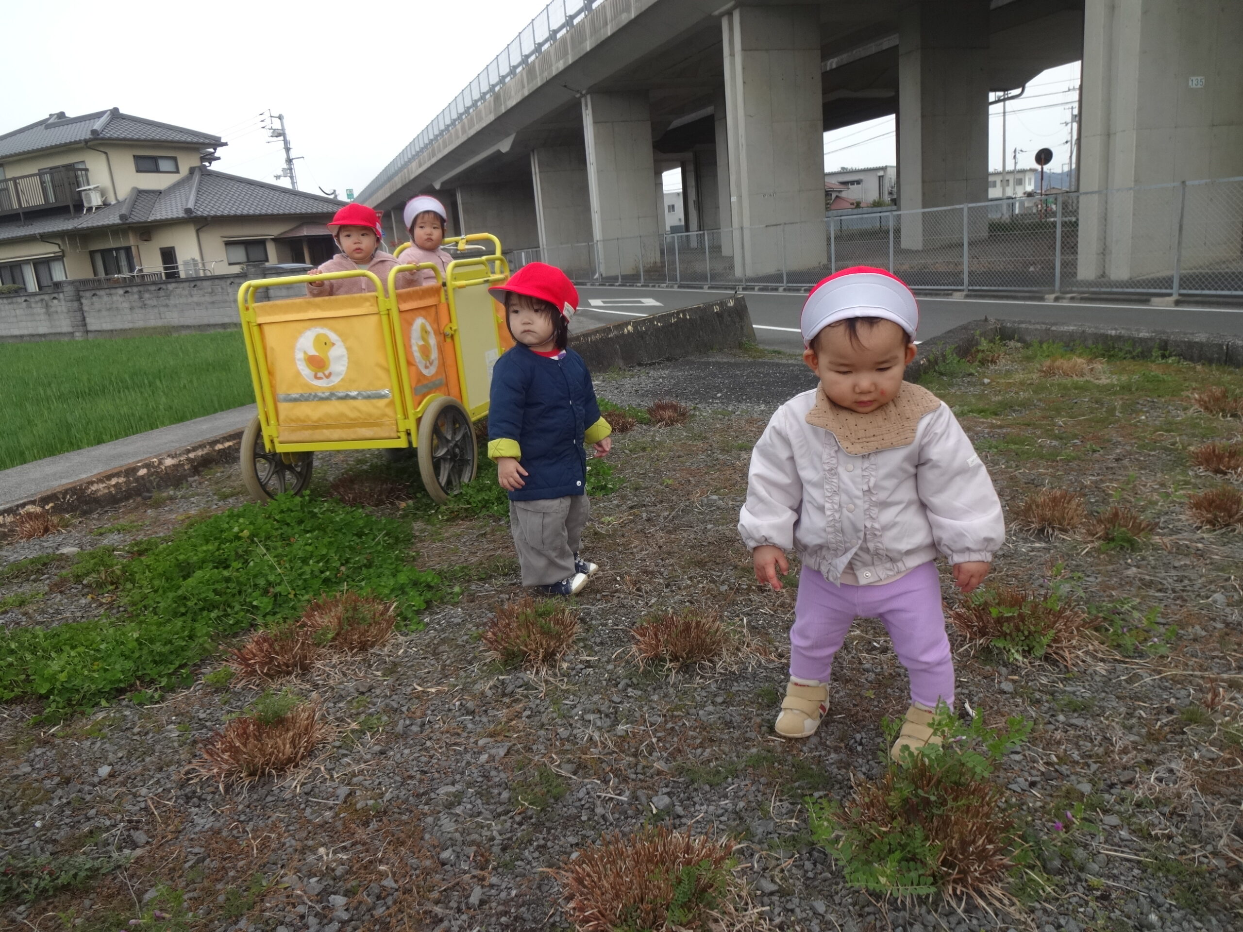 少し肌寒かったので上着を着て園周辺の散歩をして近所の空き地まで行きました。行き道で春の草花を見つけると嬉しそうに見つめたり川を覗いたりしています。空き地に到着すると座り込んで草花やつくしを触ったり、のびのび歩き回ったりして散策を楽しんでいました。保育園に戻り、遠足気分でウッドデッキでジュースを飲んだ後は園庭で遊びました。カラーセロハンを貼って作った虫眼鏡を渡すと気に入って嬉しそうに色々な所を覗いていた子ども達です。保育室に帰ると、待ちに待ったお弁当をおいしそうにパクパクと食べていました。
