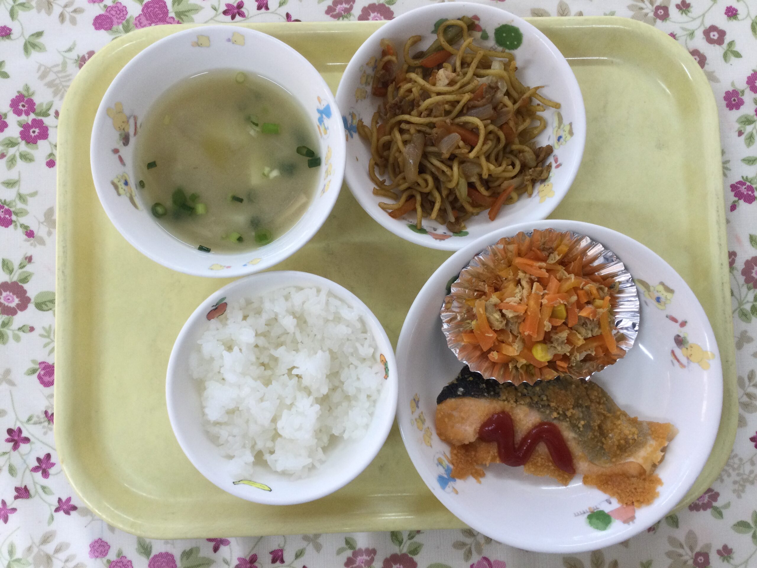 ごはん、さけのチーズ焼き、にんじんしりしり、じゃがいものみそ汁