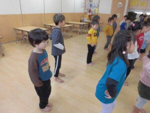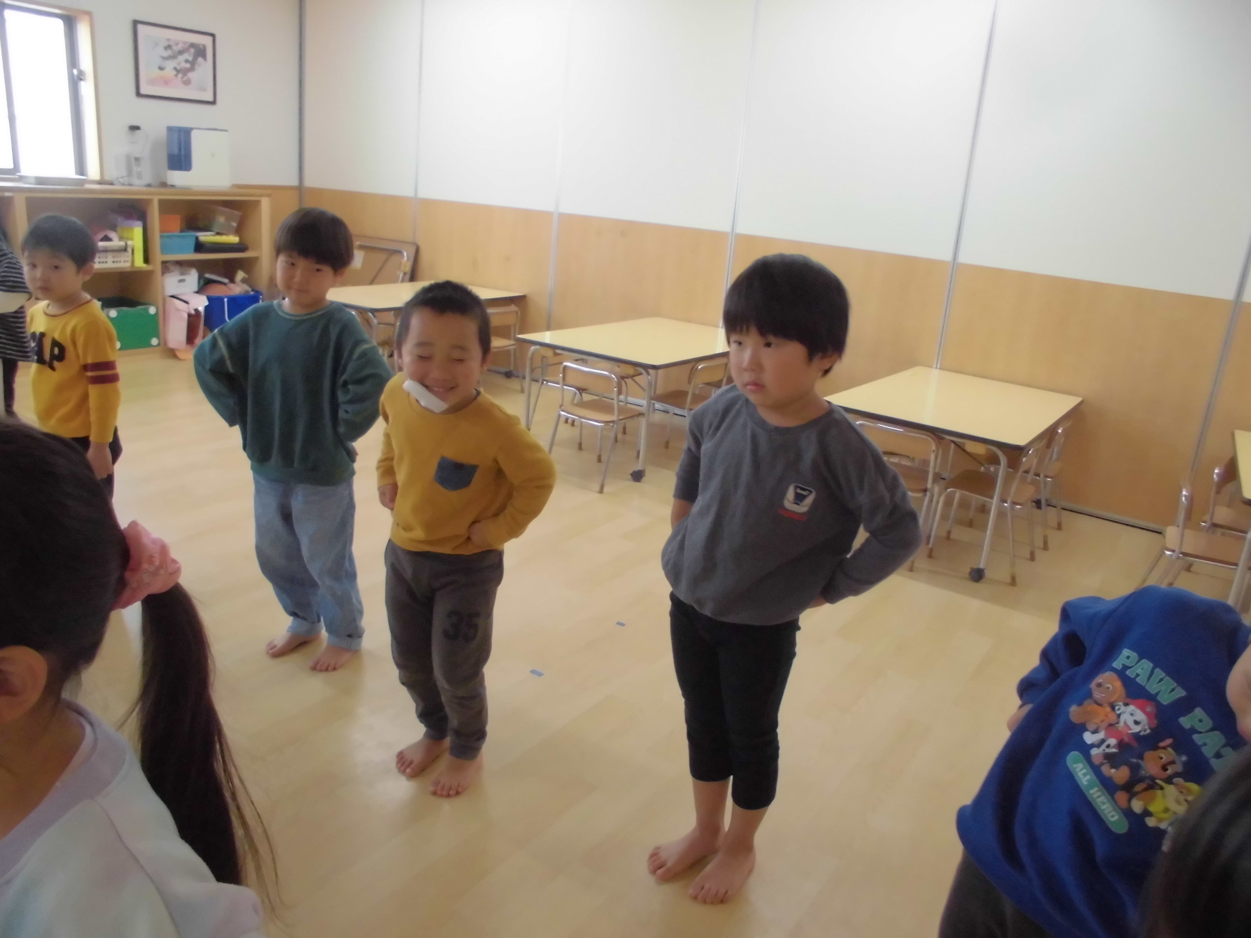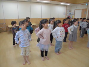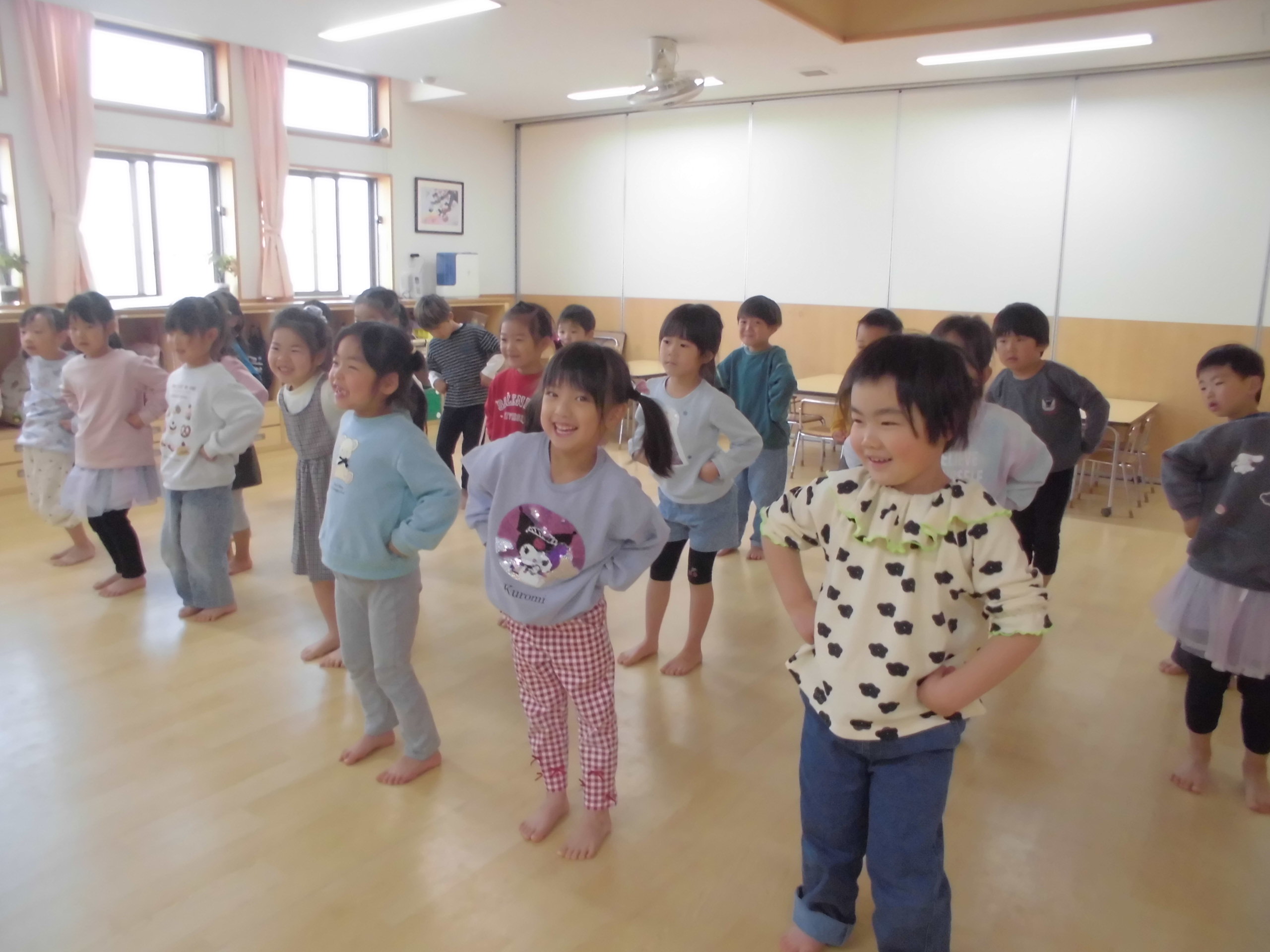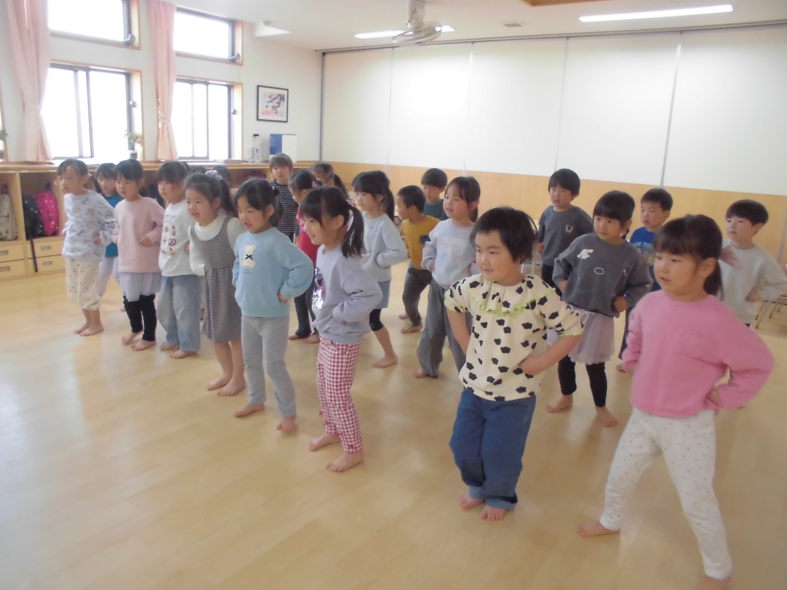少し緊張、そしてわくわくした表情の子ども達。フラダンスの講師に足の動きや腰の動かし方を教えてもらって初めてのフラダンスに挑戦しました。最後は「カモメの水兵さん」の曲に合わせて横に動くステップをしてフラダンス入門編!?を楽しみました。