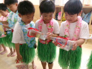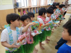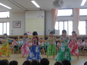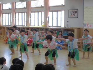 ゆり組さんのステージはフラダンス!男の子の♪ロゴ・テ・パテはパワフルでエネルギッシュなダンスです。会場が一気に南国にいるような熱い空気になり盛り上がりました。女の子の♪365日の紙飛行機はかわいくて優しい雰囲気の中、ゆり組さんとハイタッチをしてクラスに戻りました。