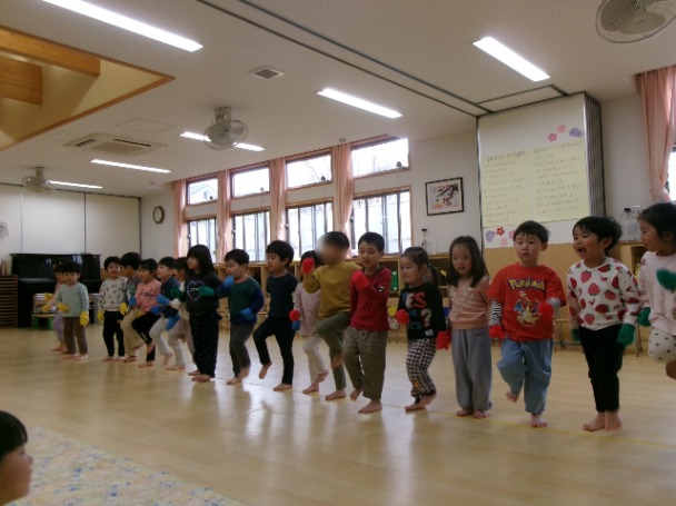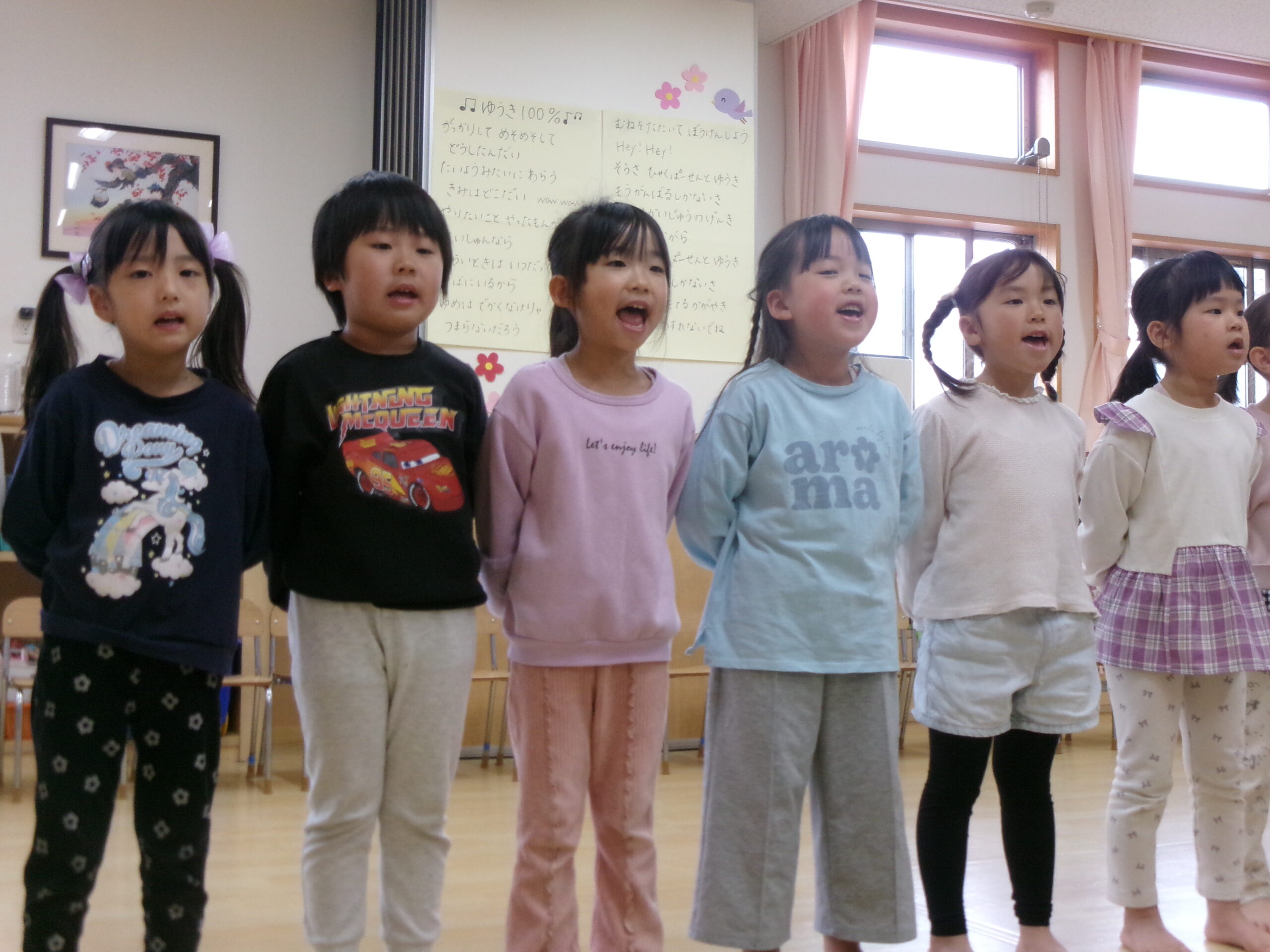 卒園するゆり組と在園児が集まり、お別れ会をしました。「ゆり組さーん」と呼ぶと「はーい」と元気な声で手を振って入場した今回の主役ゆり組さん。在園児のそばに座りDVDの鑑賞が始まります。スライドに映し出される小さい頃の姿。写真や映像の中に自分の姿や友だちの姿も見つけて嬉しそうに話しながら観ていました。その後は各クラスからの出し物です。もも組さんは♪のりのりおむすびくんの曲に合わせてかわいらしいダンスを披露してくれました。年少クラスのたんぽぽ組さんは運動会でも踊っていた♪ミッキーマウスマーチのダンス!カラーの手袋をつけて元気いっぱい踊ります。その次は年中クラスのひまわり組さん。♪あしたははれるの歌とメッセージをゆり組さんに贈りました。