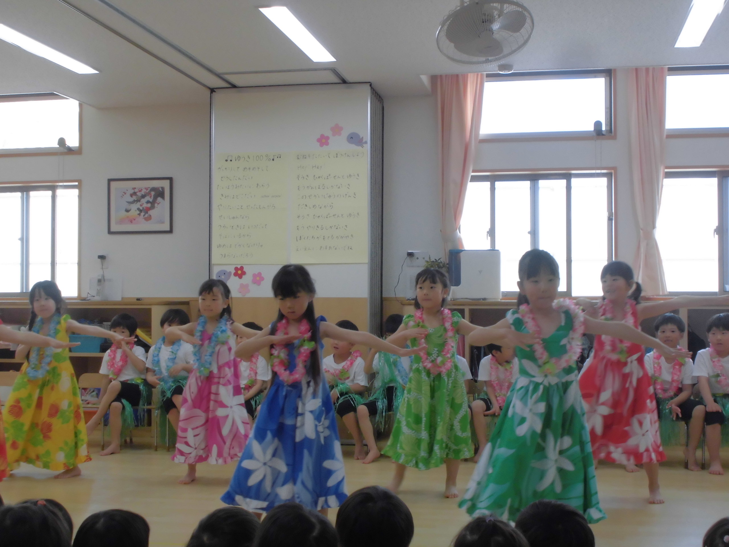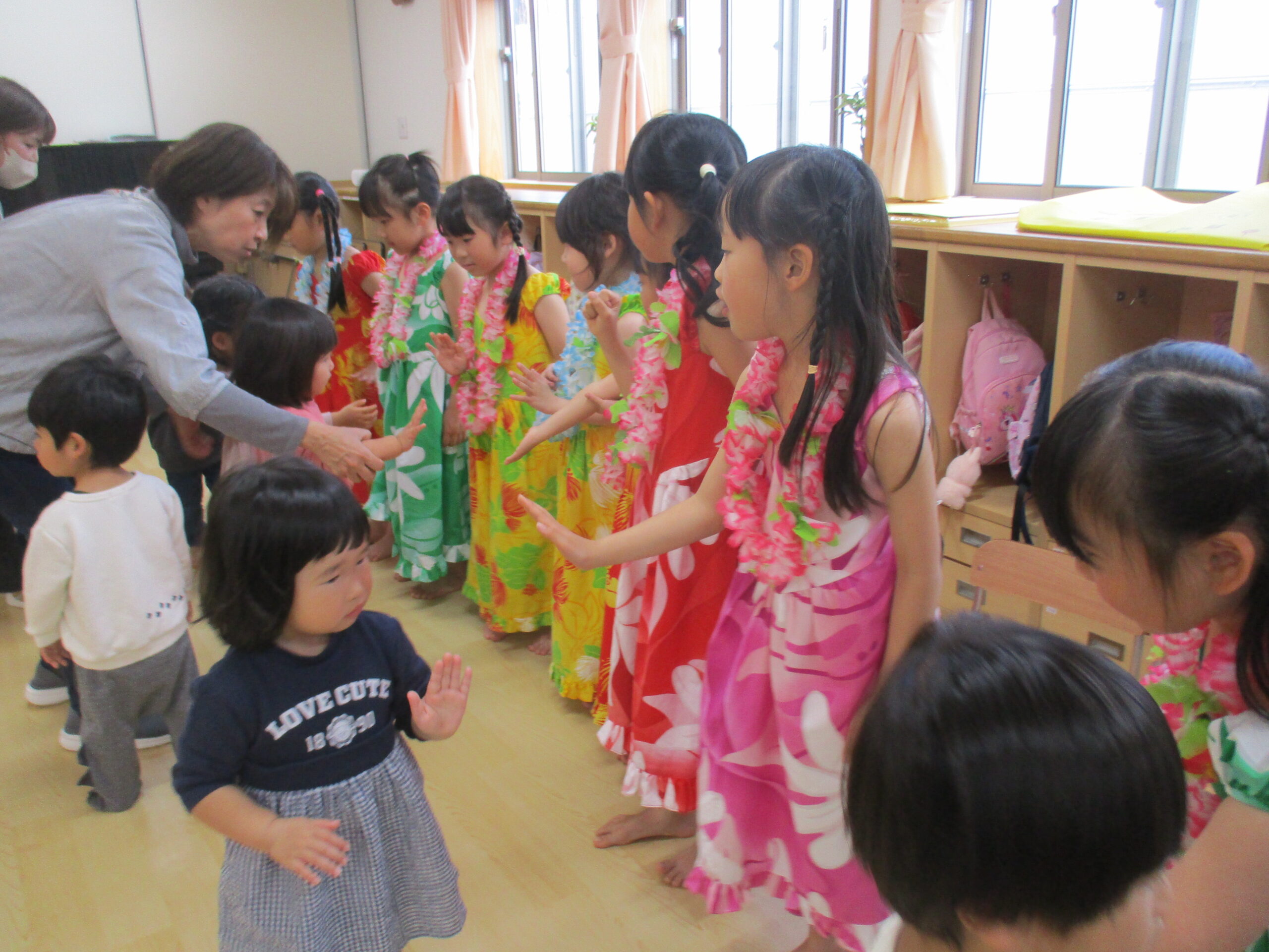 ゆり組さんのステージはフラダンス!男の子の♪ロゴ・テ・パテはパワフルでエネルギッシュなダンスです。会場が一気に南国にいるような熱い空気になり盛り上がりました。女の子の♪365日の紙飛行機はかわいくて優しい雰囲気の中、ゆり組さんとハイタッチをしてクラスに戻りました。