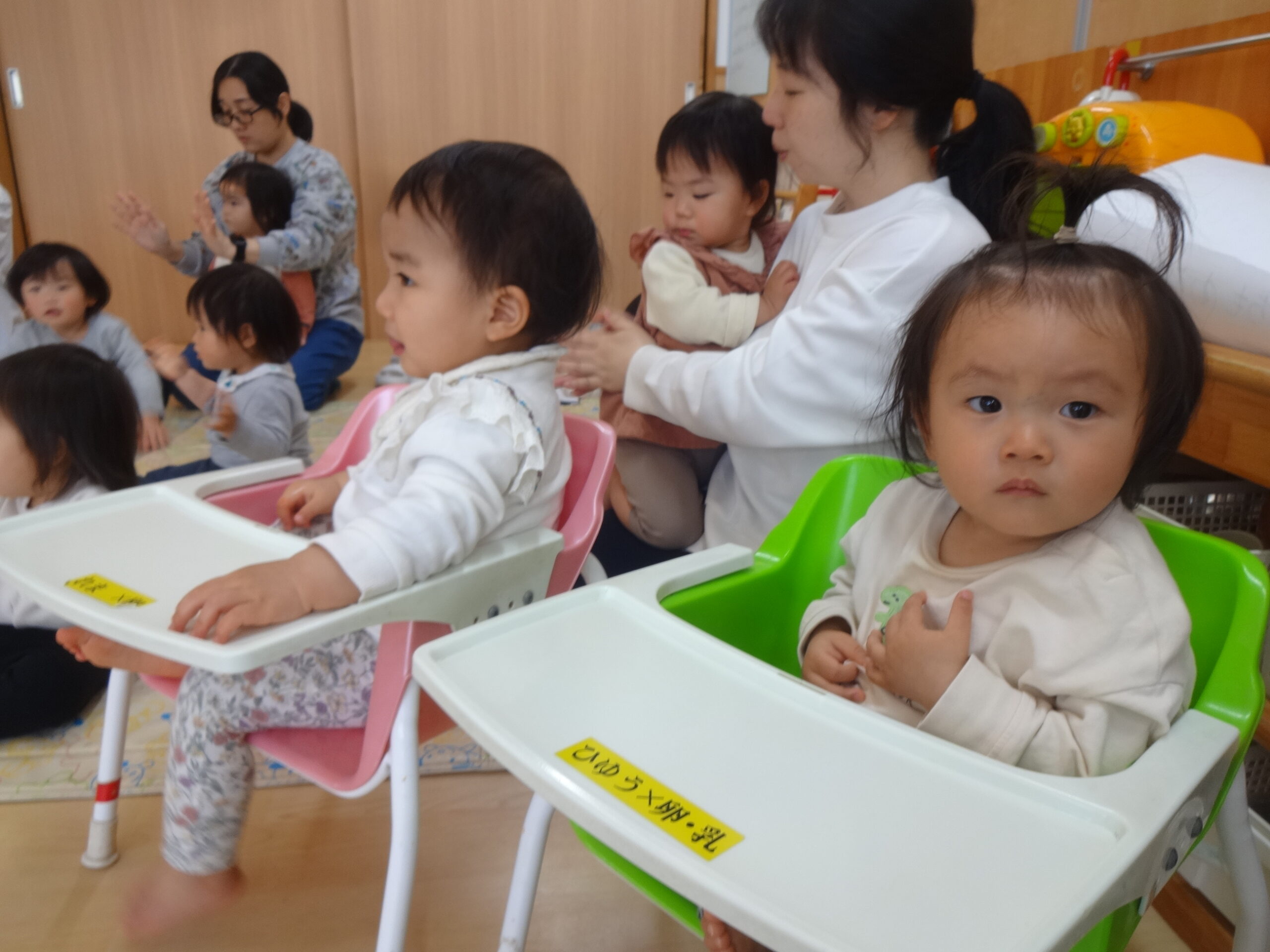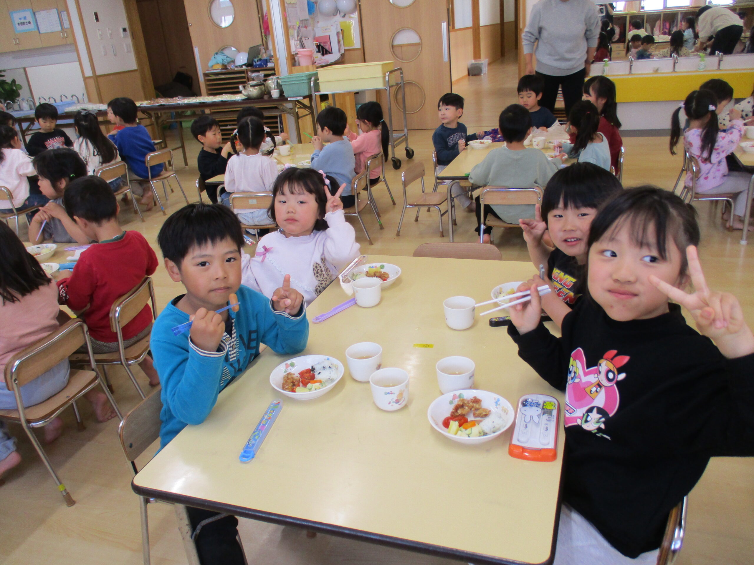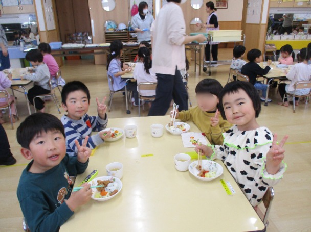 たんぽぽ組、ひまわり組、ゆり組は皆で会食。子ども達の好きなメニューが揃いおかわりもたくさんして大満足だったようです。