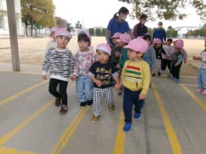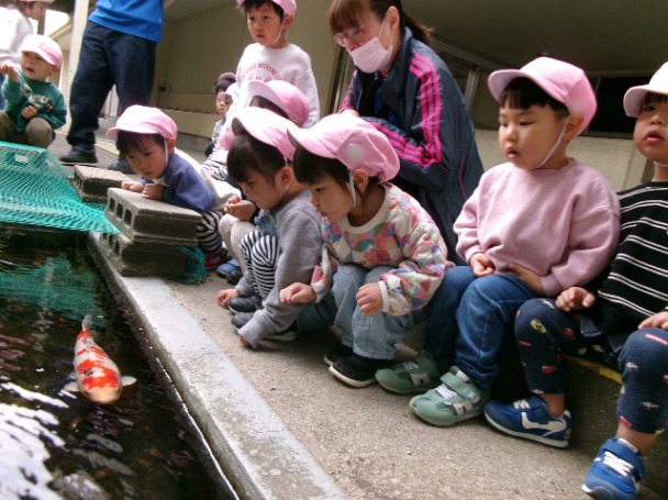 楽しみにしていたお別れ遠足。浮穴小学校まで歩き校庭を散策しました。校庭にはウサギ小屋に黒色のウサギさんがいたり、池に行くと鯉もいて、普段あまり見ない鯉に興味津々でした。保育園に戻ってからは楽しみにしていたお弁当の時間。「先生、見てー!」と見せてくれたり一つ一つ味わいながらおいしそうに食べていました。心に残る楽しい遠足になりました。