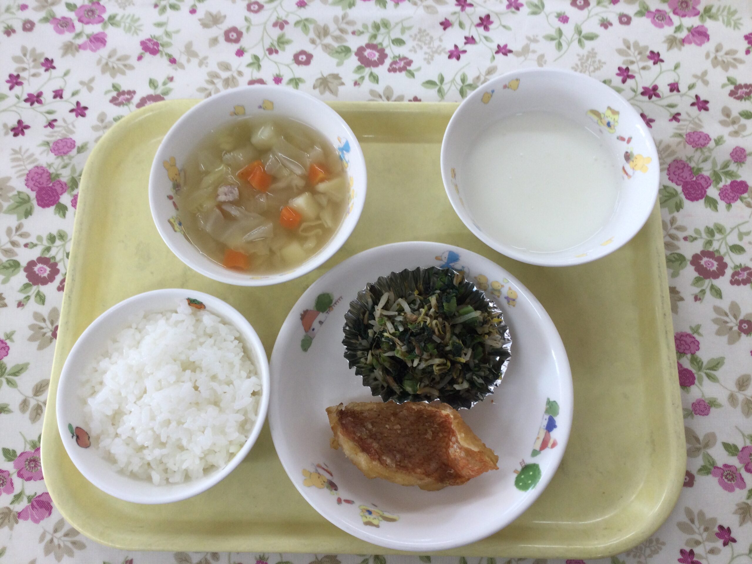 ごはん、あかうおのから揚げ、青菜の磯浸し、ポトフ風スープ