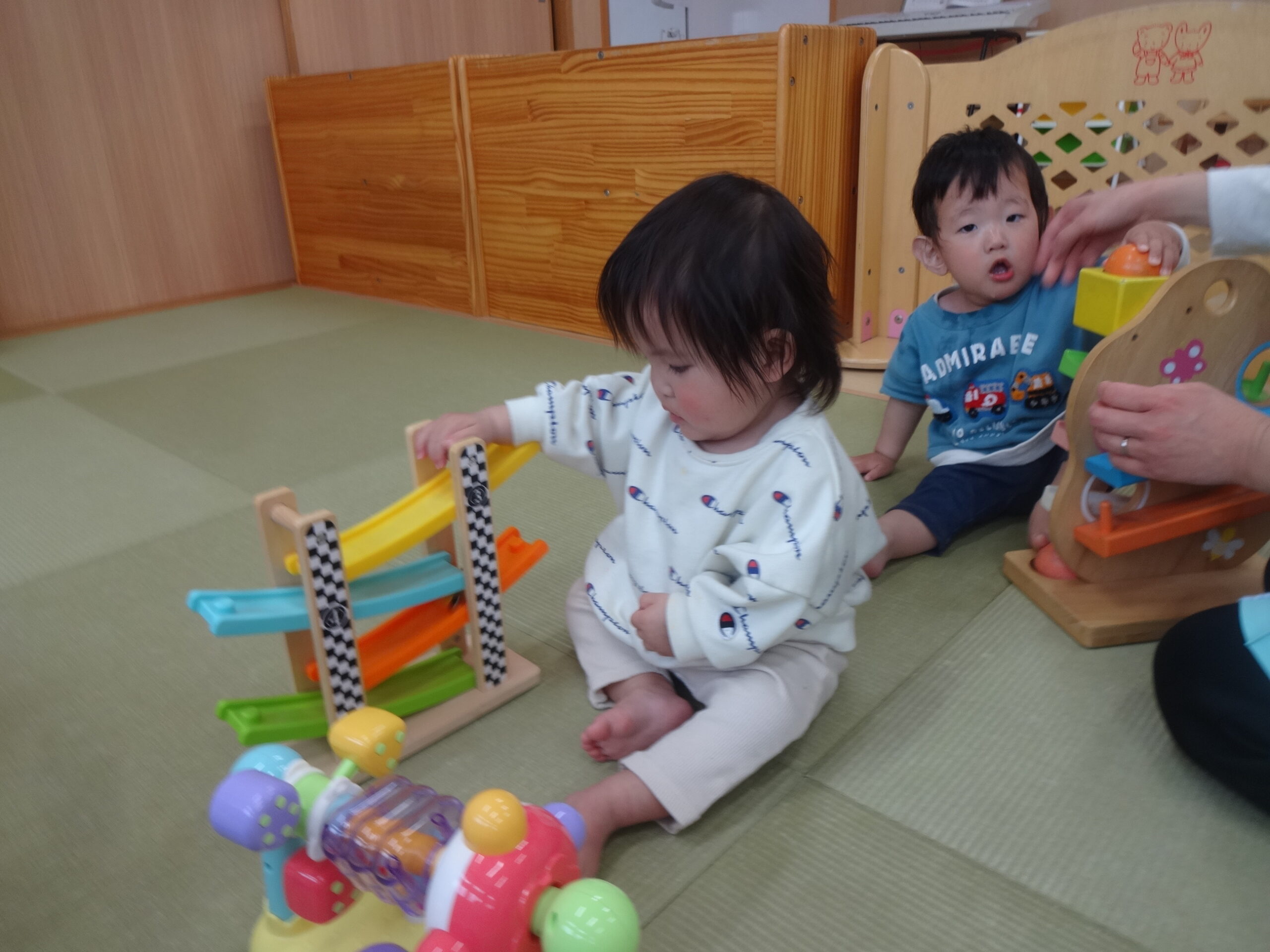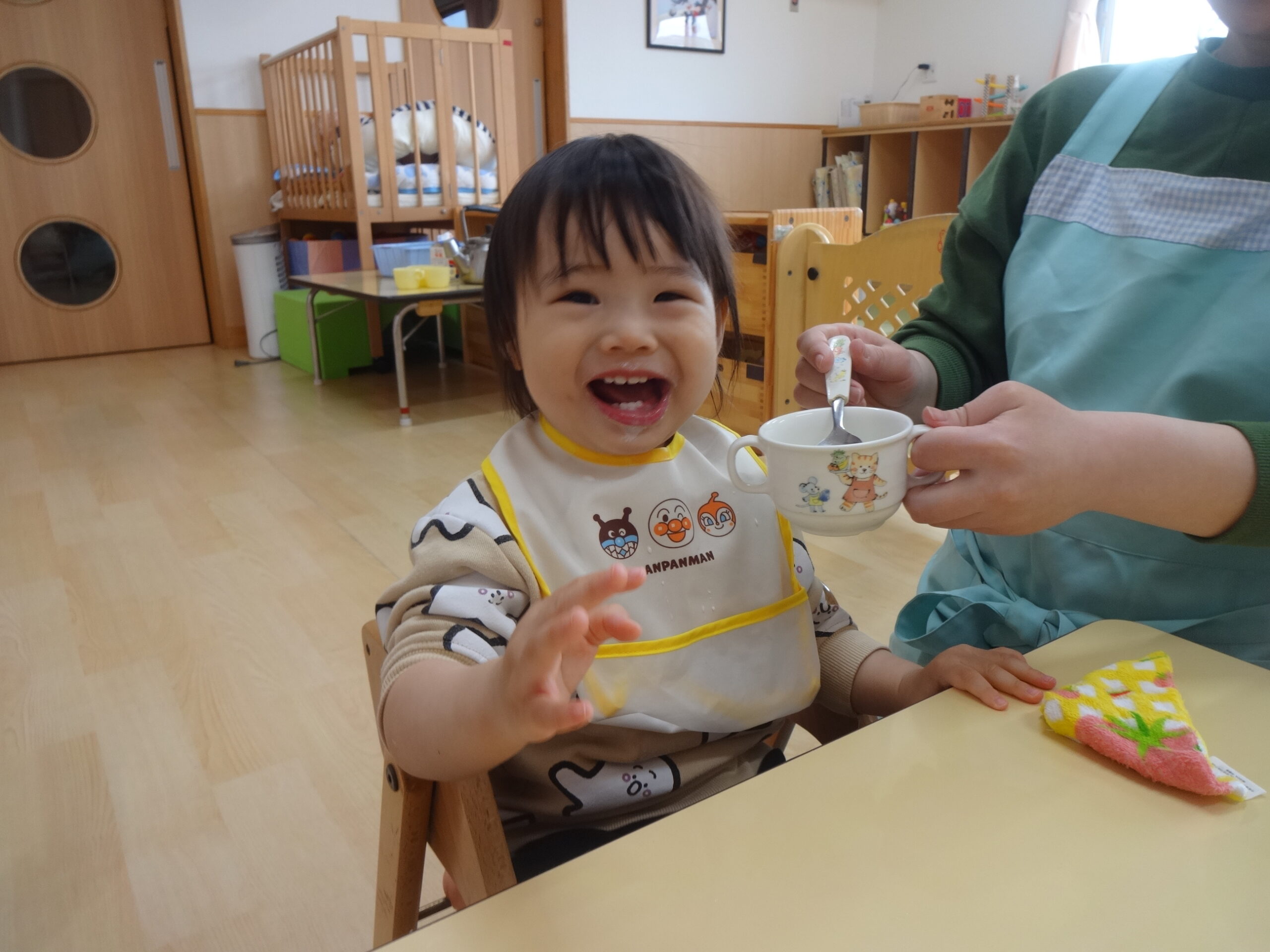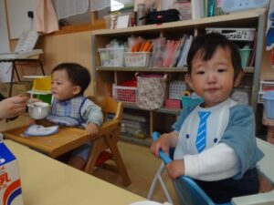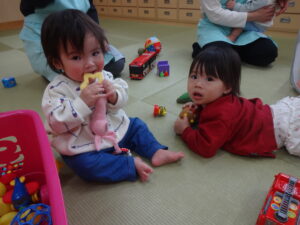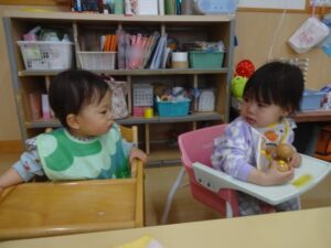 ちゅうりっぷ組での生活が始まって1週間。保護者の方と離れる時には泣いてしまう子ども達ですが少しずつ保育室にも保育士にも慣れてきています。ピアノに合わせて体を少しだけ揺らしてみたり、牛乳を飲んだり気に入ったおもちゃを触ってみたりする姿が見られています。