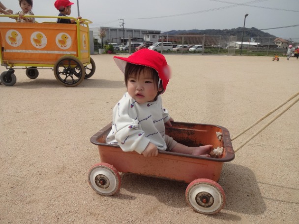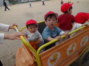 天気の良い日は散歩車に乗って広い園庭を散歩しています。周りの景色や他のクラスの友だちをじっと見たりしていますよ。