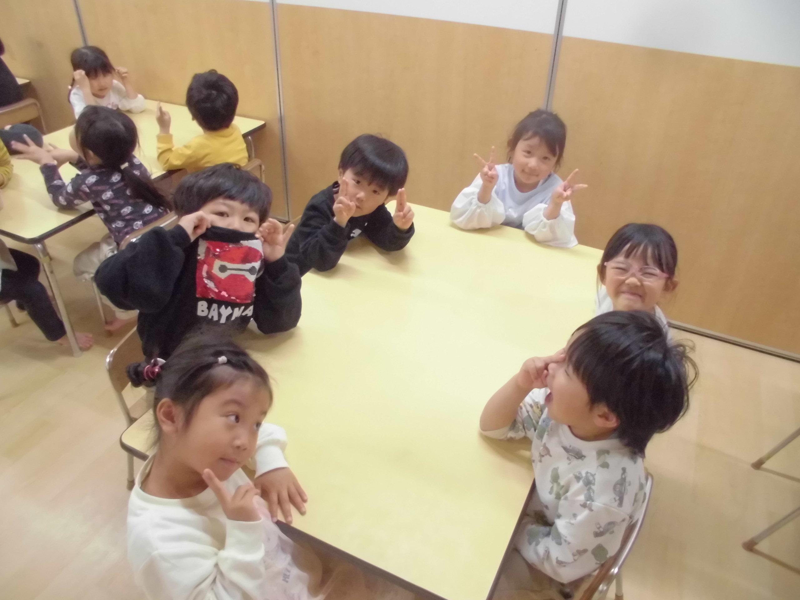 進級初日から元気いっぱいの子ども達。新しいチームのテーブルで記念写真を撮りました。カメラを向けるとかわいいポーズをとる子ども達。チーム名は海の生き物、「イルカ」「あざらし」「カニ」「ペンギン」です。これから、このチームで一緒に給食を食べたり制作活動を行ったり、当番活動をしたりしていきたいと思います。