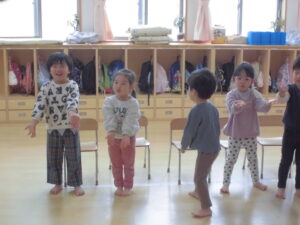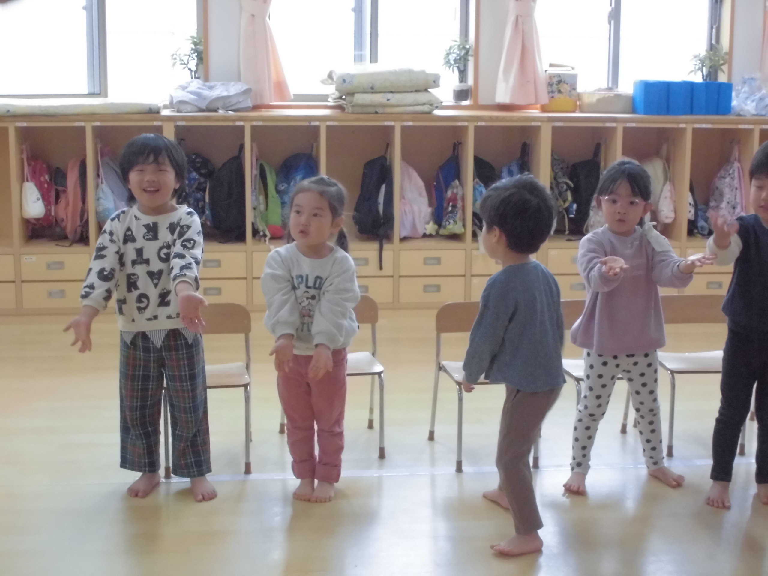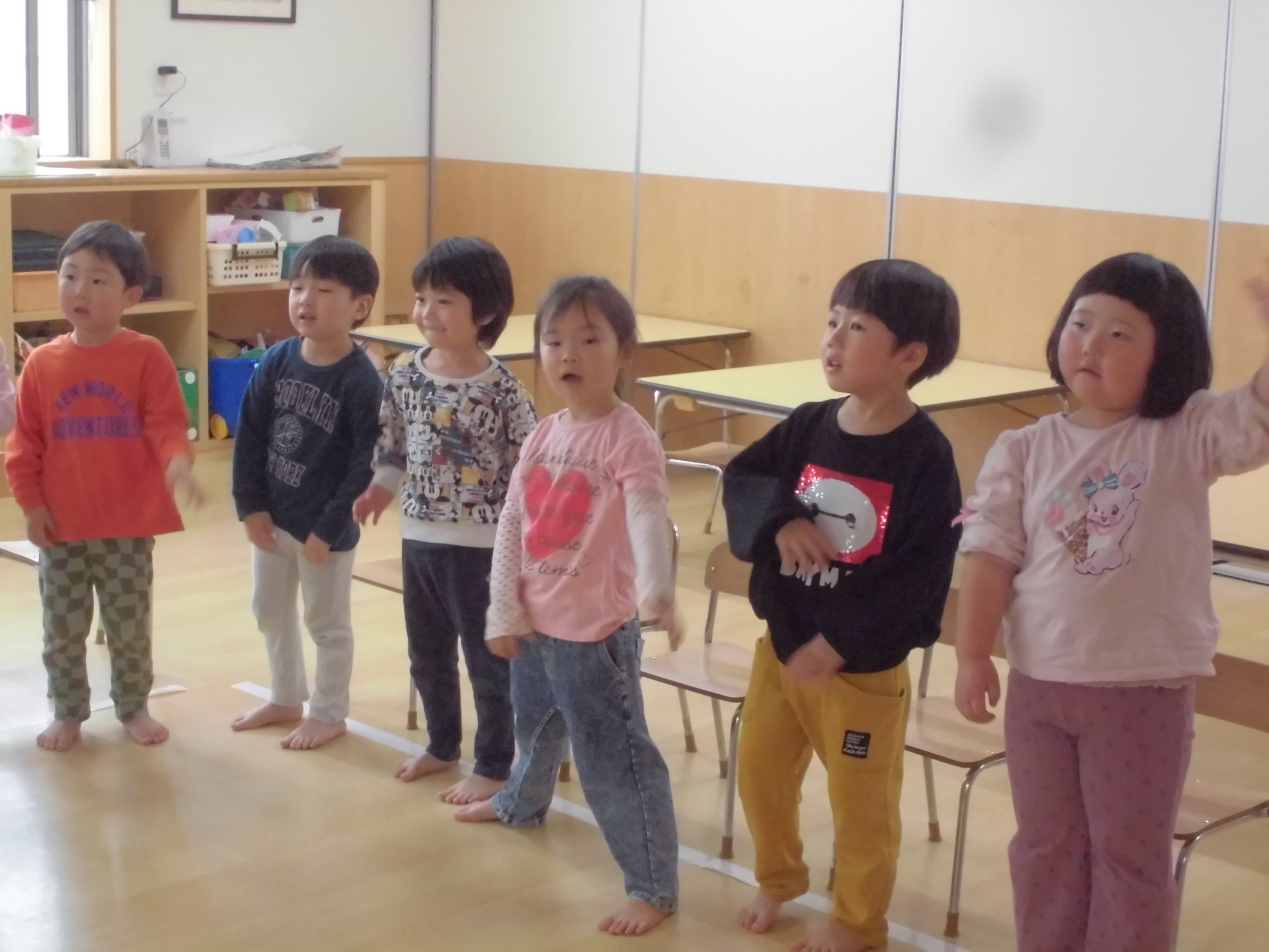年中クラスになり“1~10の数字”や“天気を表す単語”など身振り、手振りをつけて学んでいます。