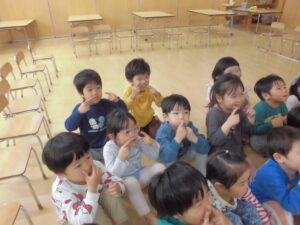 クラススナップ ホーム クラススナップ ひまわり組 英語教室 ひまわり組 年中クラスになり“1~10の数字”や“天気を表す単語”など身振り、手振りをつけて学んでいます。 絵本が始まるとじっと考えたり、あっと驚いたり、大笑いしたり、色々な表情を見せながら学ぶ姿がありました。 毎月ある英語教室は子ども達にとって楽しみな時間のひとつのようです。 前の記事 お知らせ一覧 カテゴリ カテゴリーを選択 クラススナップ トピックス アトム少年少女合唱団 給食 よくあるご質問 ちゅうりっぷ組 ばら組 もも組 たんぽぽ組 ひまわり組 ゆり組 今月の行事 各種ダウンロード アーカイブ 月を選択 2026年4月 (25) 2026年3月 (33) 2026年2月 (31) 2026年1月 (33) 2025年12月 (32) 2025年11月 (26) 2025年10月 (34) 2025年9月 (32) 2025年8月 (34) 2025年7月 (36) 2025年6月 (35) 2025年5月 (33) 2025年4月 (37) 2025年3月 (32) 2025年2月 (31) 2025年1月 (34) 2024年12月 (36) 2024年11月 (35) 2024年10月 (37) 2024年9月 (33) 2024年8月 (34) 2024年7月 (38) 2024年6月 (36) 2024年5月 (37) 2024年4月 (37) 2024年3月 (32) 2024年2月 (28) 2024年1月 (34) 2023年12月 (35) 2023年11月 (33) 2023年10月 (35) 2023年9月 (32) 2023年8月 (43) 2023年7月 (40) 2023年6月 (44) 2023年5月 (46) 2023年4月 (37) 2023年3月 (49) 2023年2月 (39) 2023年1月 (35) 2022年12月 (29) 2022年11月 (10) 2022年10月 (3) 2022年9月 (7) 2022年8月 (4) 2022年7月 (8) 2022年6月 (10) 2022年5月 (9) 2022年4月 (9) 2022年3月 (1) 2019年7月 (1) 2018年4月 (1) 2015年12月 (1) 2015年11月 (2) 2015年5月 (1)
