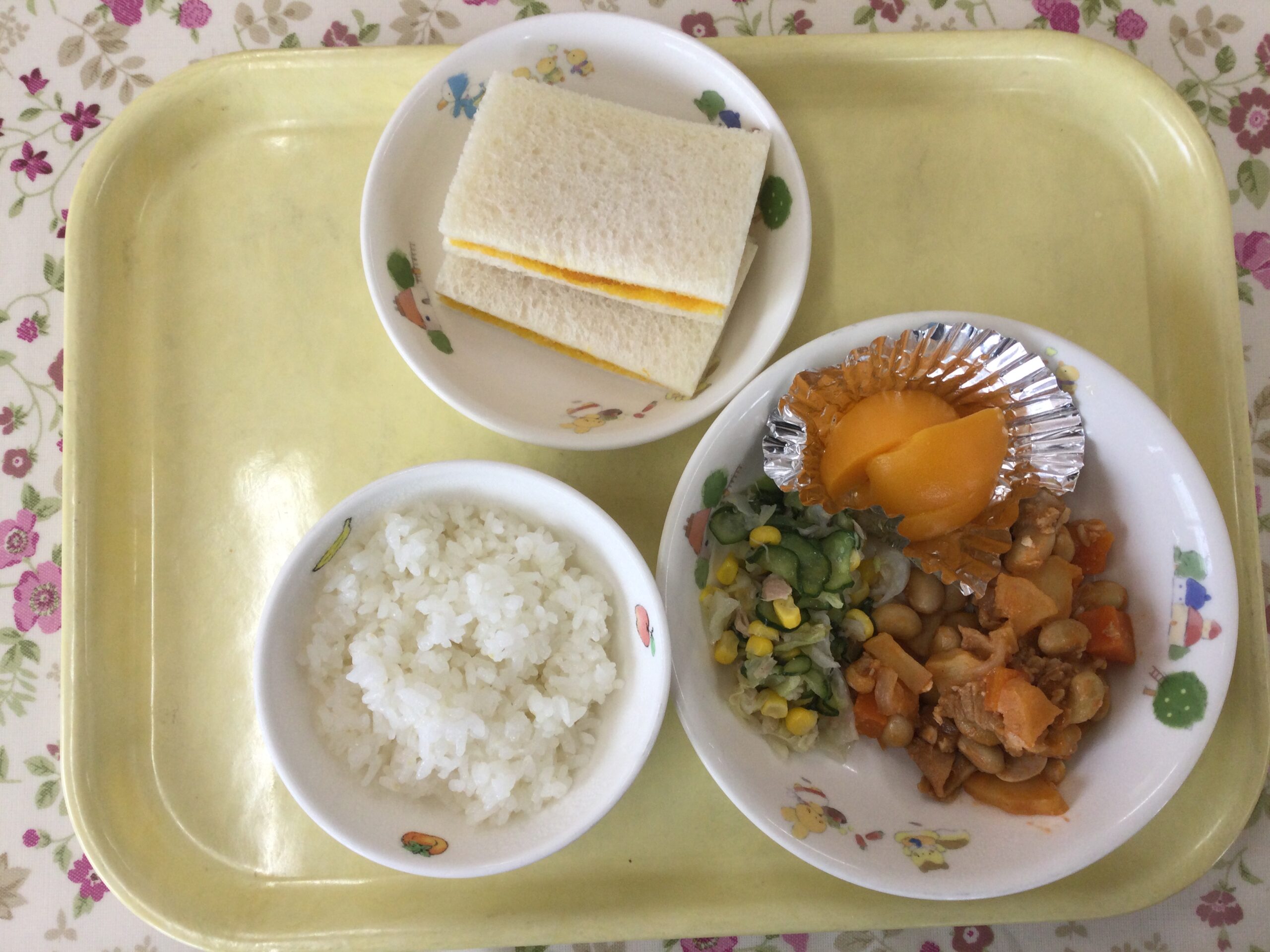 ごはん、ポークビーンズ、ツナとキャベツののサラダ、黄桃缶