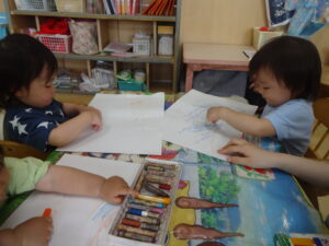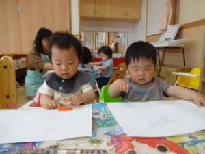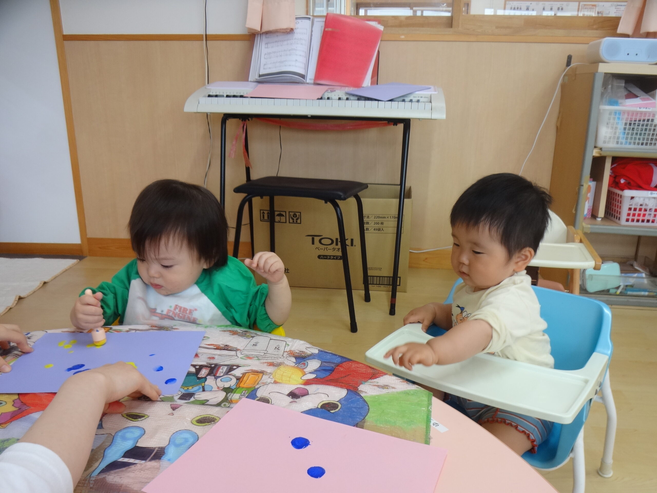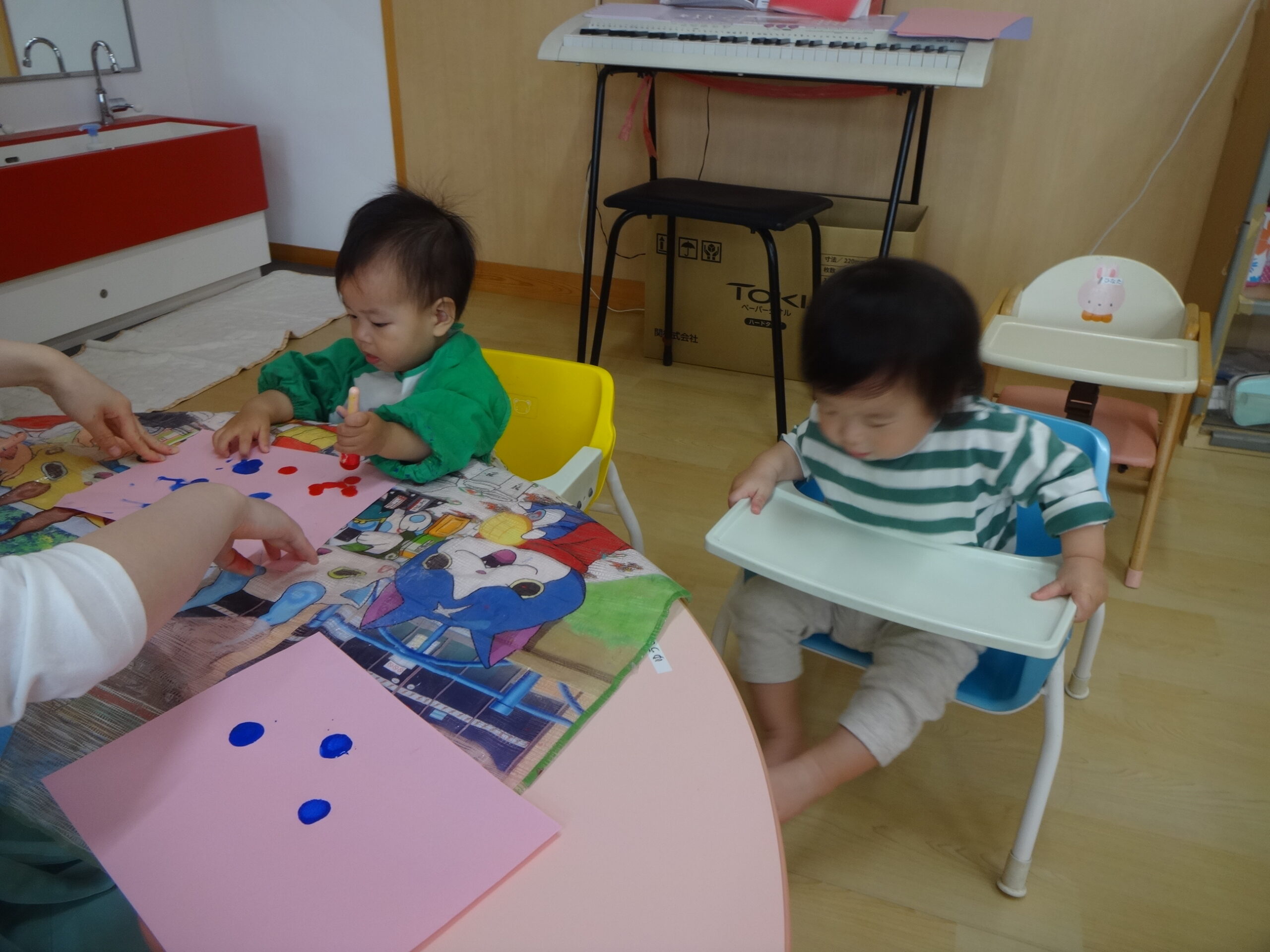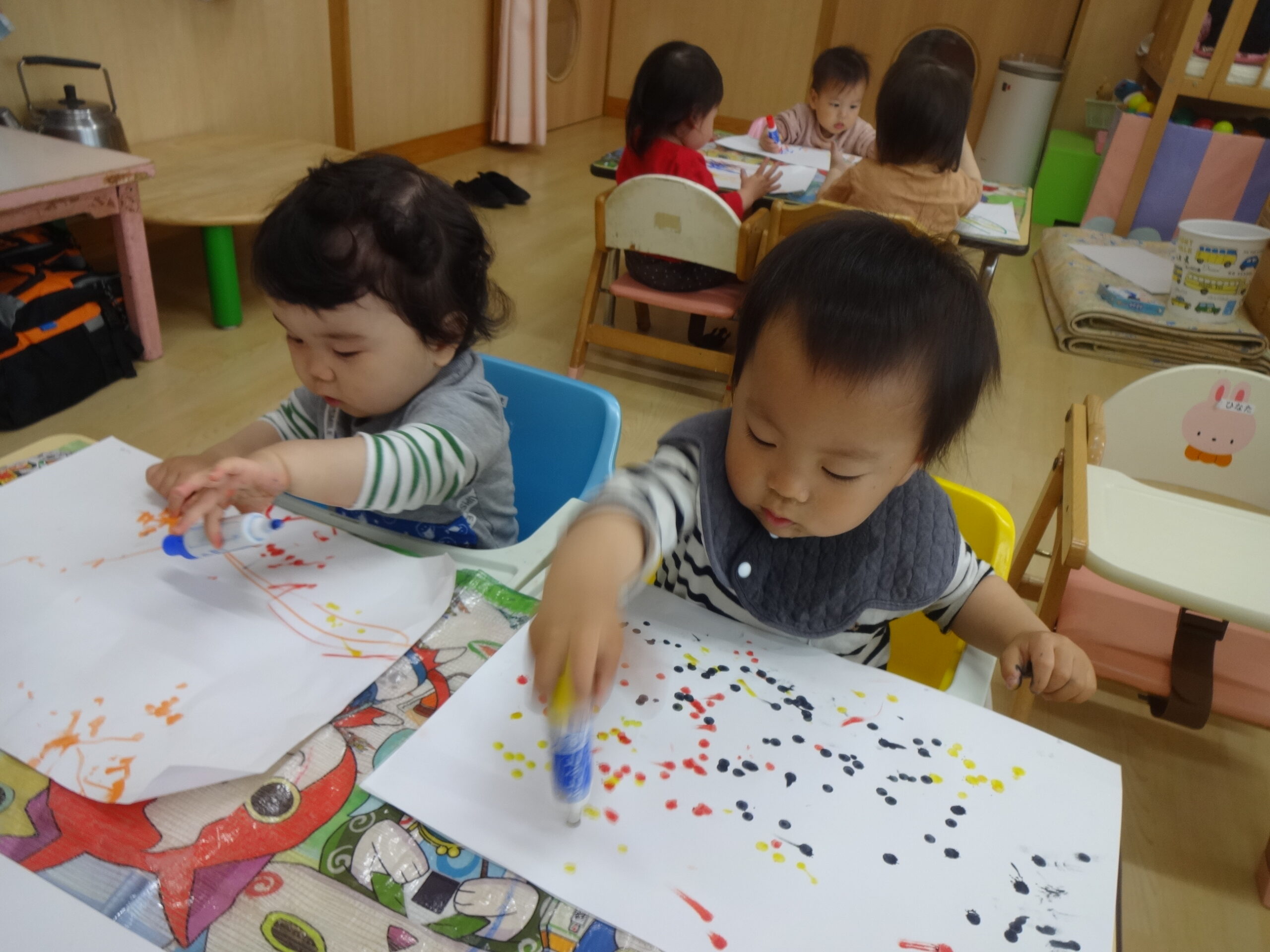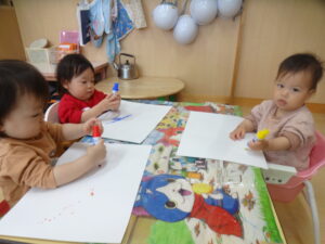 太いカラーマーカー、クレヨン、絵の具のタンポなど、色々な素材を使ってなぐり描きを楽しみました。点々を描いて色が付くのを楽しむ子どもや、のびのびと画用紙にクレヨンを動かしてみる子どもなど、様々な成長の過程が見られます。タンポでは、保育士を真似して『ポンポン』通して上手にできていました。
