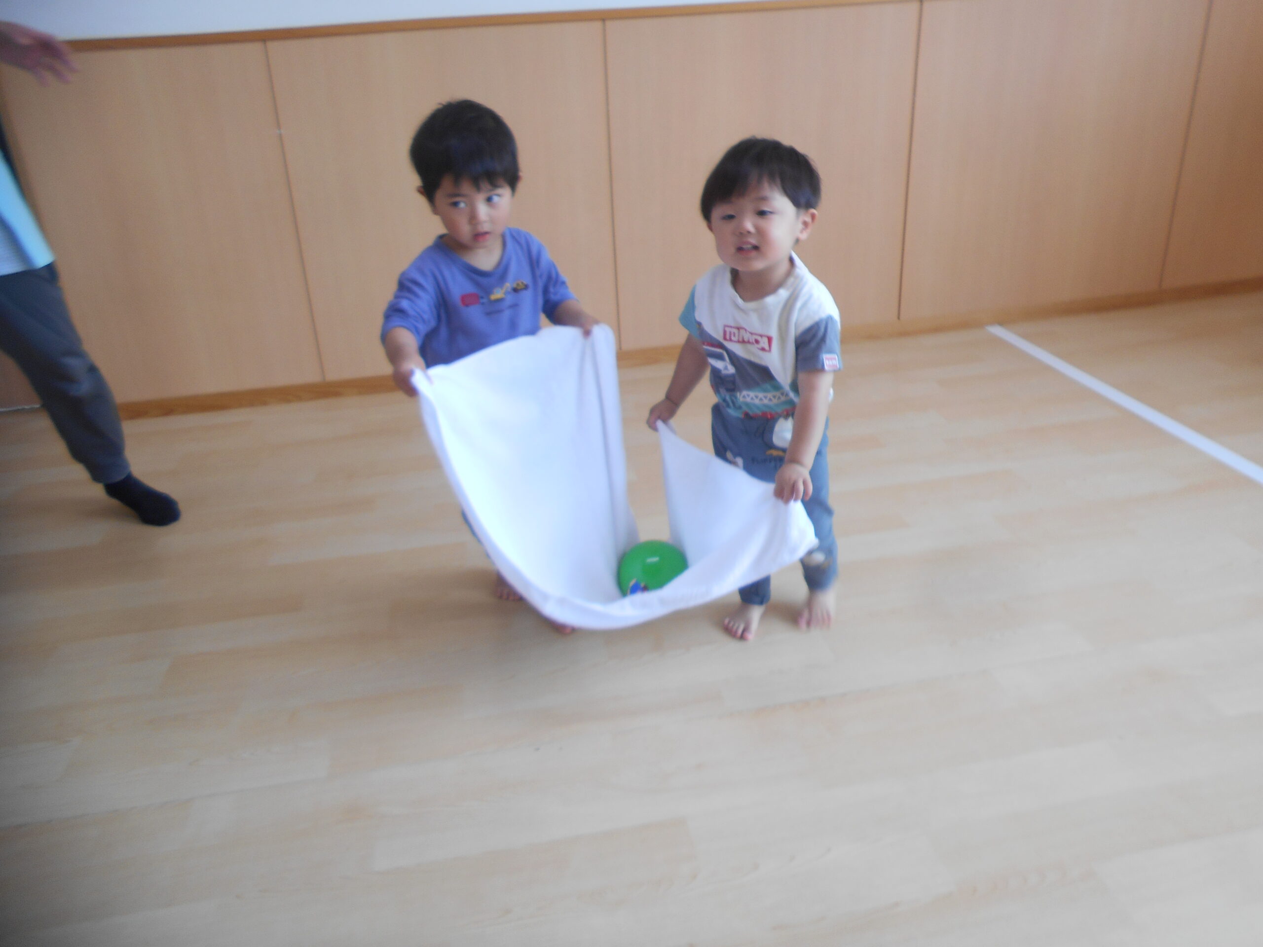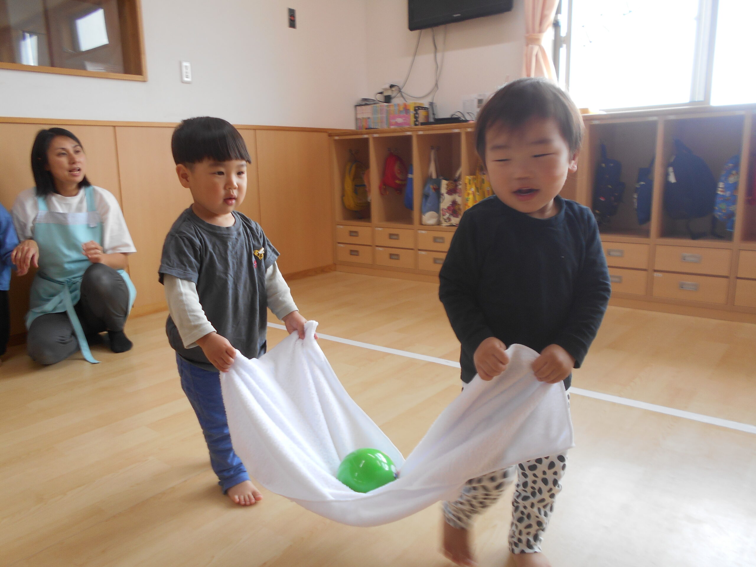 二人一組でタオルにボールを乗せて運びます。速く行こうと、力強く引っ張るとボールが落ちてしまうので、真剣な顔でそーっと運ぶ子ども達。待っている間も「がんばれ―」と応援したり、手拍子をしたりして皆で楽しみました。