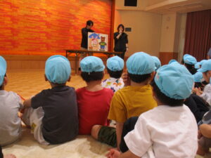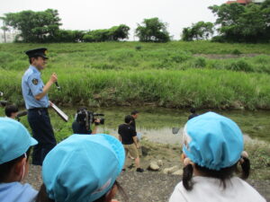 水の事故防止教室では、警察官の方のお話を聞き『子どもだけで行かない』『《きけん》と書いてある所に入らない』『溺れそうな人を見つけた時には、大きな声で「たすけて~!」と言い、大人の人に知らせる』という3つの約束をしました。