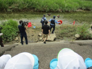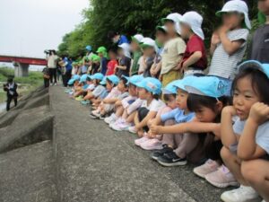 実際に近くの河で、どのような危険なことが起こるのか見せてもらい、子ども達も水の怖さを知りました。とても真剣に観ていて「あぶない!」「《きけん》て書いてあるよ。」と教えてあげる姿も見られました。