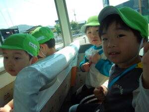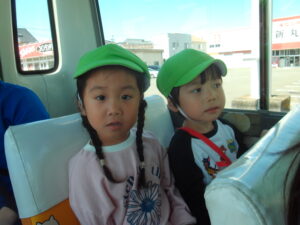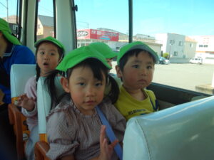 バスに乗ることをずっと前から楽しみにしていた子ども達。バスの中では、活動について話しを聞いたり、皆で歌を歌ったり、手遊びをして楽しく過ごしています。