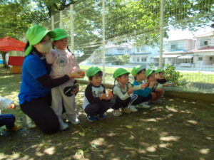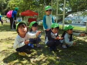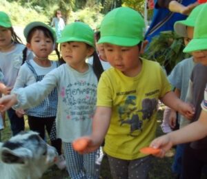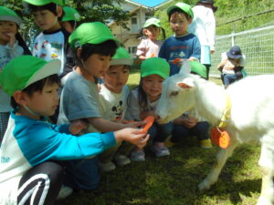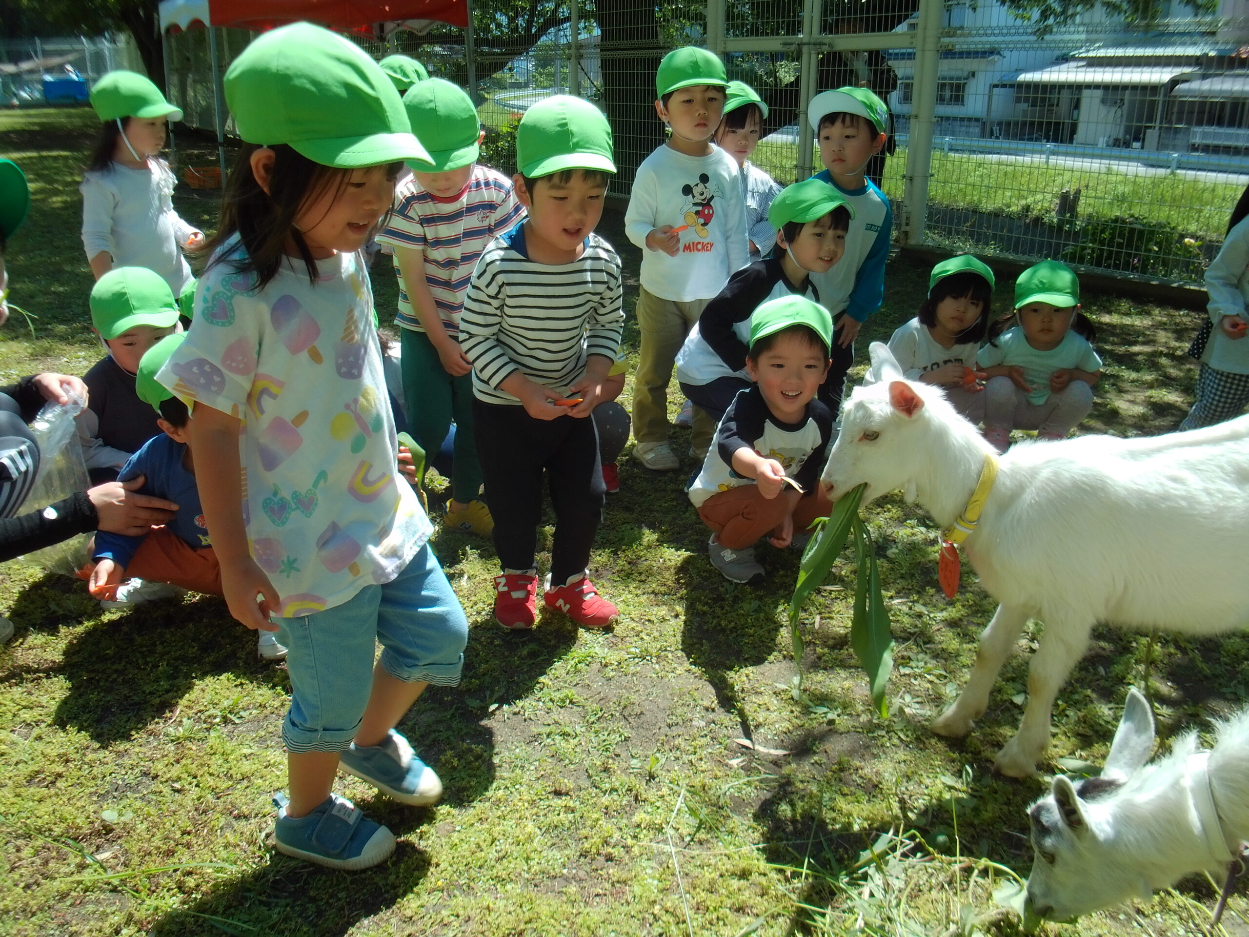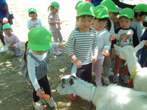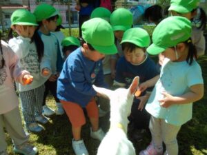 天山保育園に到着すると、早速可愛いヤギを見つけて「メェメェさんおるね。」「かわいい!」と大喜びの子ども達。ニンジンをあげたり、そっと触ってみたり、ヤギとの触れ合いを楽しみました。