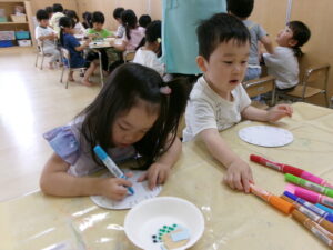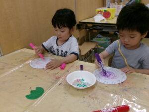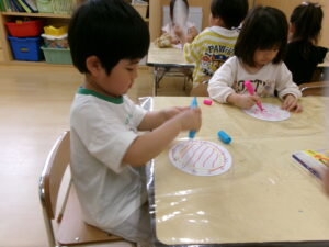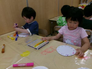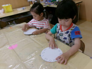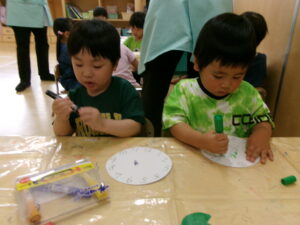 時計に興味をもっていて、はりきって制作に取りかかりました。知っている数字を指差したり、保育士と一緒に『1・2・3・・・12』と数えたりもしました。