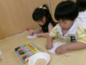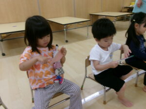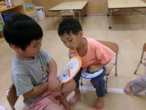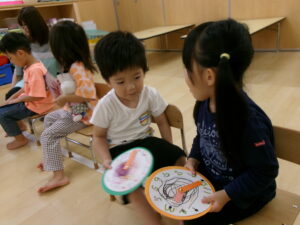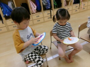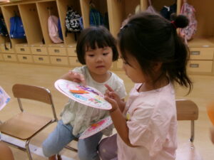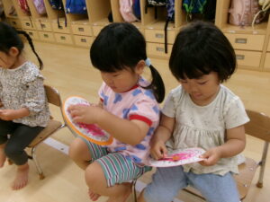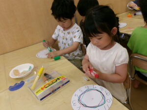 6月10日の『時の記念日』に時計が完成し、自分が作った時計を嬉しそうに触ってみるたんぽぽ組さん。くるくる針を回してみたり「3時」「12時」など、保育士を真似て針を合わせたりして楽しみました。時間や、時間を守る事の大切さをこれから少しずつ伝えていきたいと思います。