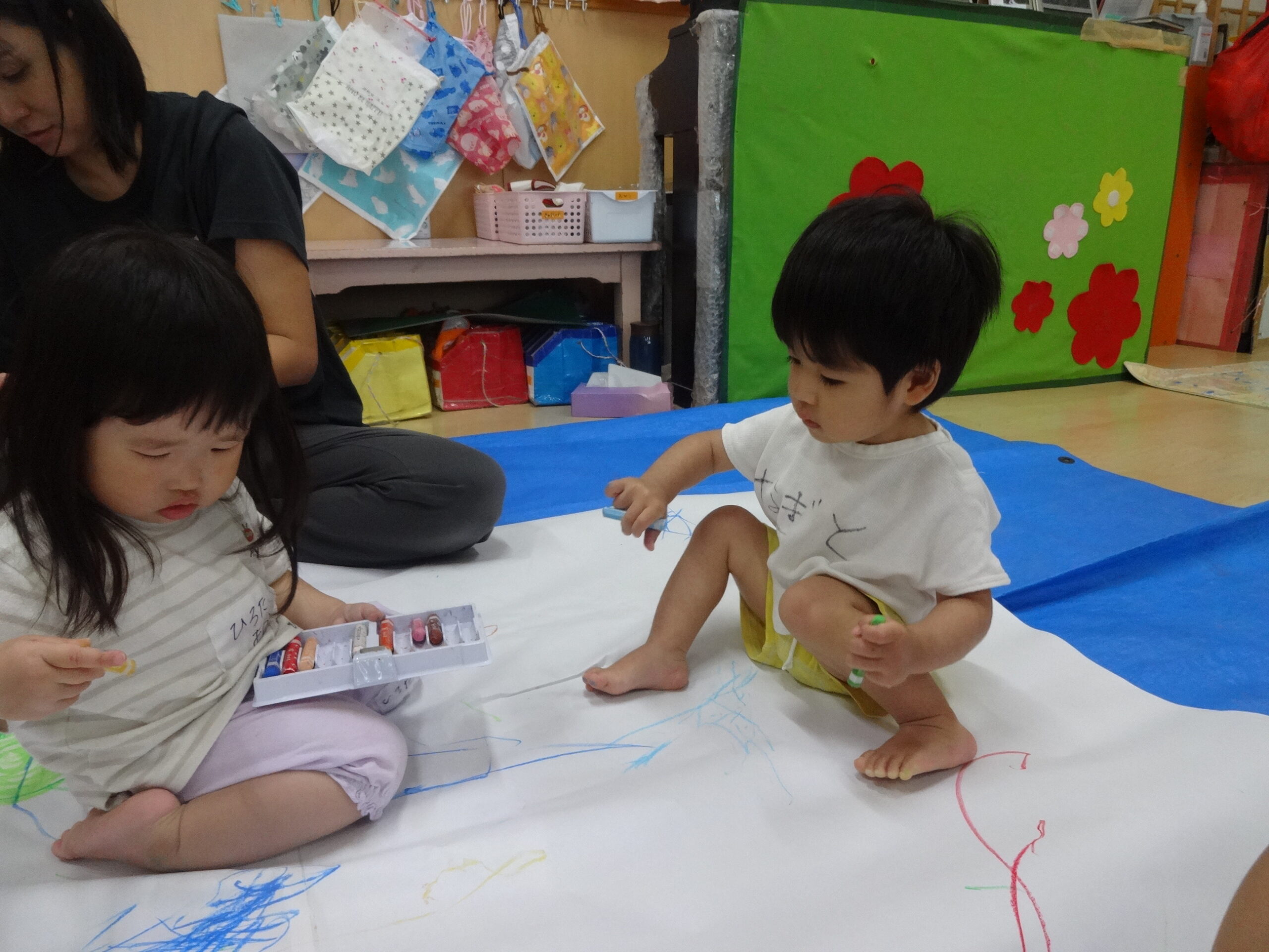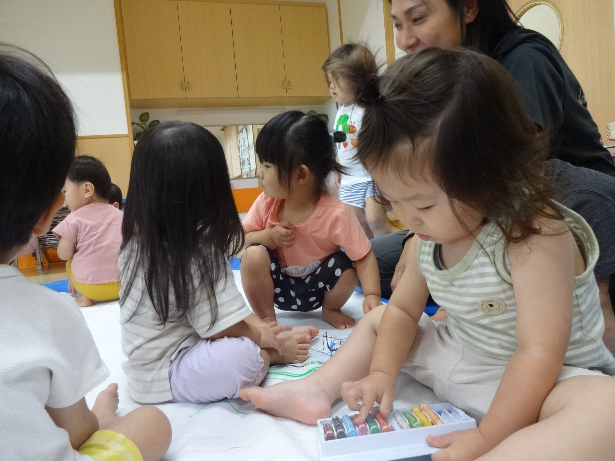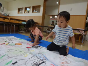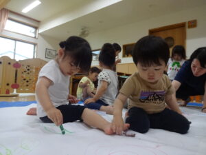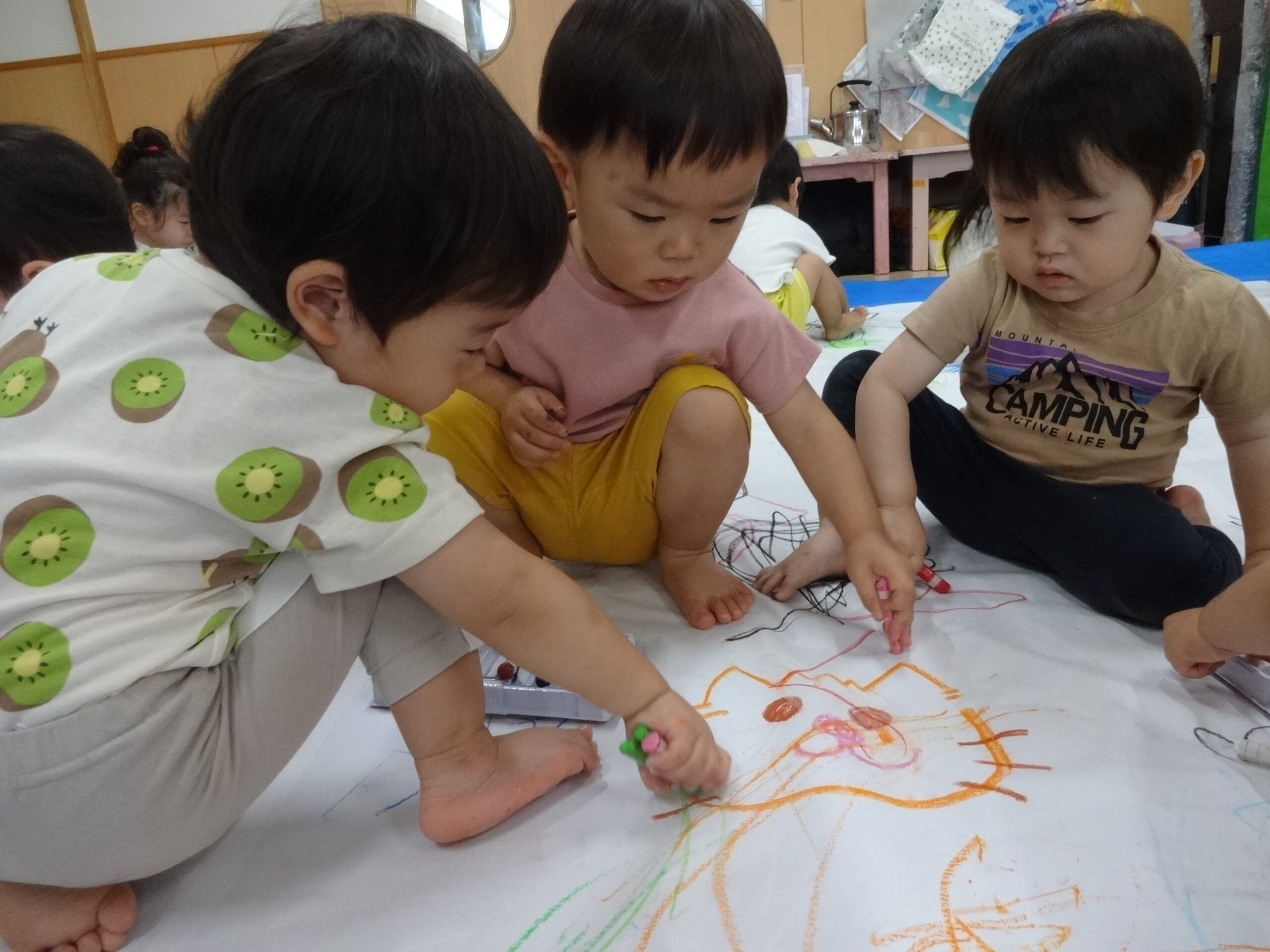 大きく繋げた模造紙にクレヨンでお絵描きをしました。最初は、おそるおそる描いていた子ども達も、慣れてくると自分の好きな色のクレヨンを選んで、友だちや保育士と『どんな色が好き♪』の歌うたいながら、ダイナミックに楽しんでいました。