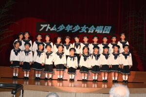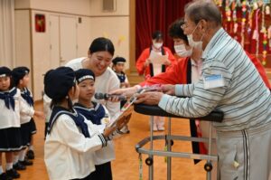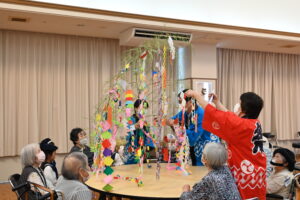 7月7日の午後から、八倉医院のデイサービス利用者さんと七夕交流を行いました。アトム少年少女合唱として『手のひらを太陽に』と『ふるさと』を歌った後、ふれあい遊びをしました。『しあわせなら手をたたこう』と『肩たたき』の曲でトントンと手を合わせたり、優しく肩たたきをする等して、利用者さんもみんな笑顔で楽しんでいました。