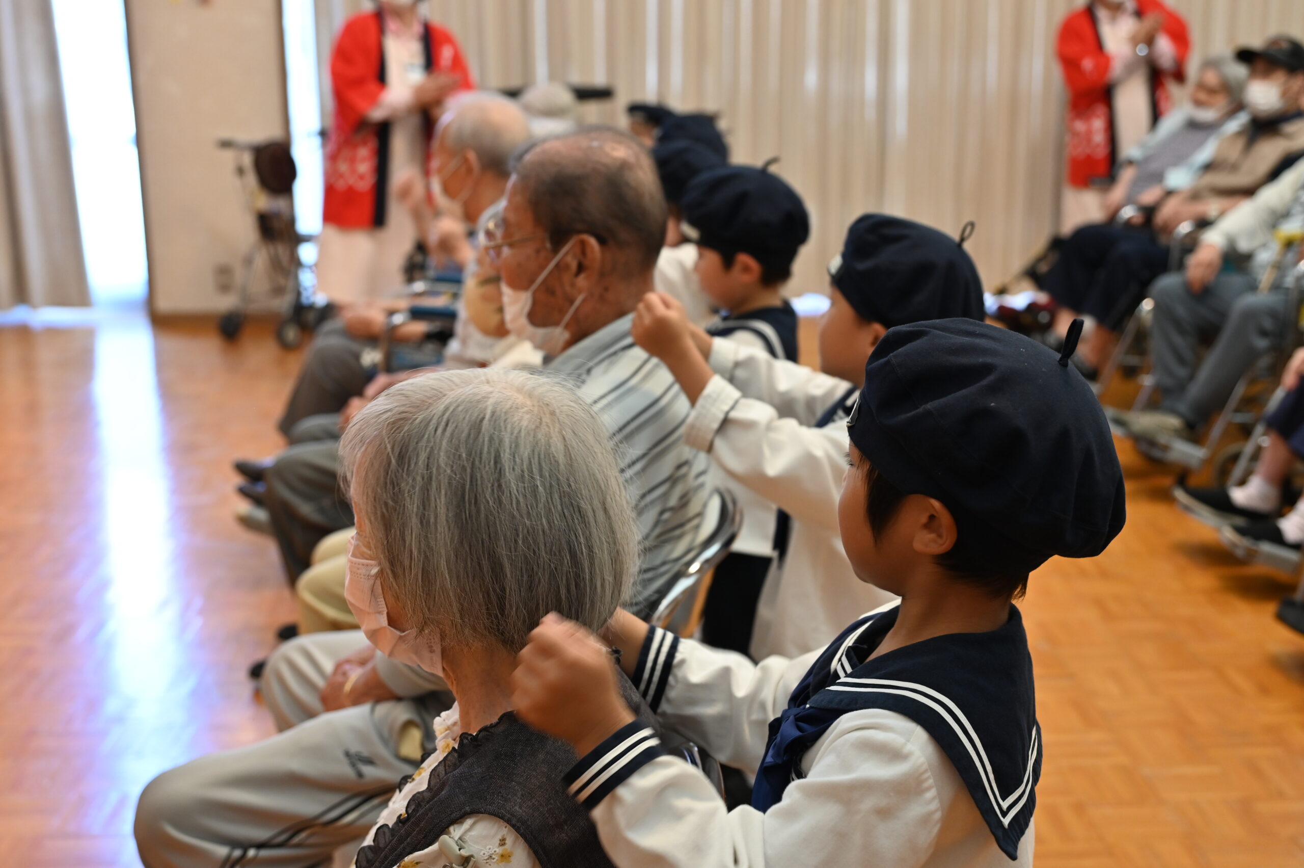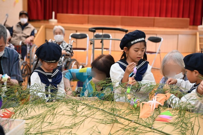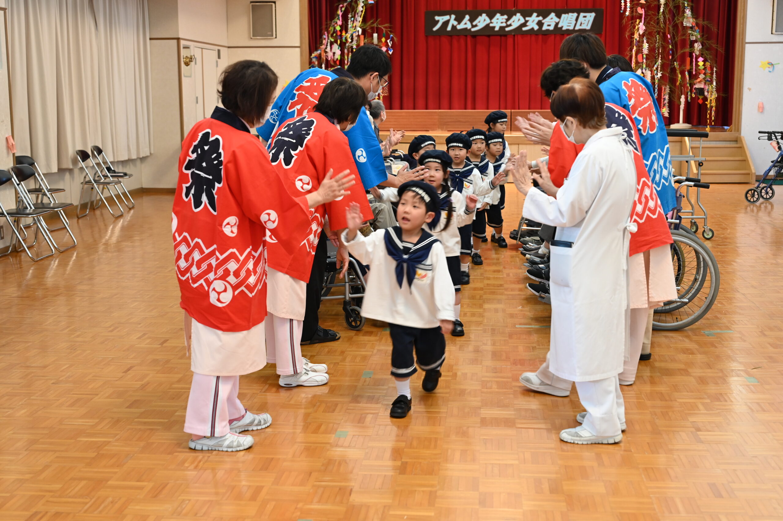7月7日の午後から、八倉医院のデイサービス利用者さんと七夕交流を行いました。アトム少年少女合唱として『手のひらを太陽に』と『ふるさと』を歌った後、ふれあい遊びをしました。『しあわせなら手をたたこう』と『肩たたき』の曲でトントンと手を合わせたり、優しく肩たたきをする等して、利用者さんもみんな笑顔で楽しんでいました。