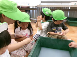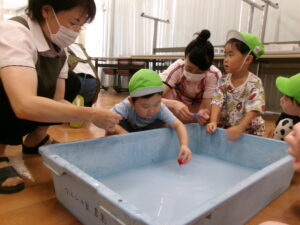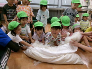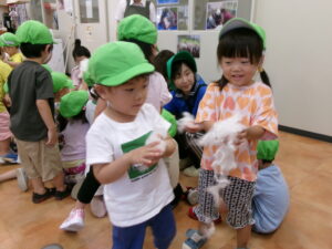 クラススナップ ホーム クラススナップ たんぽぽ組 アルムの里でキーホルダー作り たんぽぽ組 アルムの里へキーホルダー作りに出かけました。前日から『バスに乗れる‼』と楽しみにしていた子ども達。バスの中での約束事を聞いたり、羊のクイズや『メリーさんのひつじ』の歌を歌ったりと楽しみながらアルムの里へ行きました。 キーホルダー作りの前に、羊の毛を触らせてもらい「ふわふわ。」「気持ちいいね。」と言いながら、友だちや保育士と顔を見合わせる姿があり、可愛かったです。 キーホルダー作りでは、なかなか羊毛がくっつかなくて苦戦!施設の方に手伝ってもらいながら「くっつけ!くっつけ‼」と想いを込めて丸めていきました。丸め終わると「見て。」と嬉しそうに見せてくれました。 その後は、みんなで写真撮影をしました。 前の記事 お知らせ一覧 次の記事 カテゴリ カテゴリーを選択 クラススナップ トピックス アトム少年少女合唱団 給食 よくあるご質問 ちゅうりっぷ組 ばら組 もも組 たんぽぽ組 ひまわり組 ゆり組 今月の行事 各種ダウンロード アーカイブ 月を選択 2025年10月 (3) 2025年9月 (29) 2025年8月 (34) 2025年7月 (36) 2025年6月 (35) 2025年5月 (33) 2025年4月 (37) 2025年3月 (32) 2025年2月 (31) 2025年1月 (34) 2024年12月 (36) 2024年11月 (35) 2024年10月 (37) 2024年9月 (33) 2024年8月 (34) 2024年7月 (38) 2024年6月 (36) 2024年5月 (37) 2024年4月 (37) 2024年3月 (32) 2024年2月 (28) 2024年1月 (34) 2023年12月 (35) 2023年11月 (33) 2023年10月 (35) 2023年9月 (32) 2023年8月 (43) 2023年7月 (40) 2023年6月 (44) 2023年5月 (46) 2023年4月 (37) 2023年3月 (49) 2023年2月 (39) 2023年1月 (35) 2022年12月 (29) 2022年11月 (10) 2022年10月 (3) 2022年9月 (7) 2022年8月 (4) 2022年7月 (8) 2022年6月 (10) 2022年5月 (9) 2022年4月 (9) 2022年3月 (1) 2019年7月 (1) 2018年4月 (1) 2015年12月 (1) 2015年11月 (2) 2015年5月 (1)