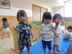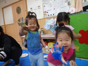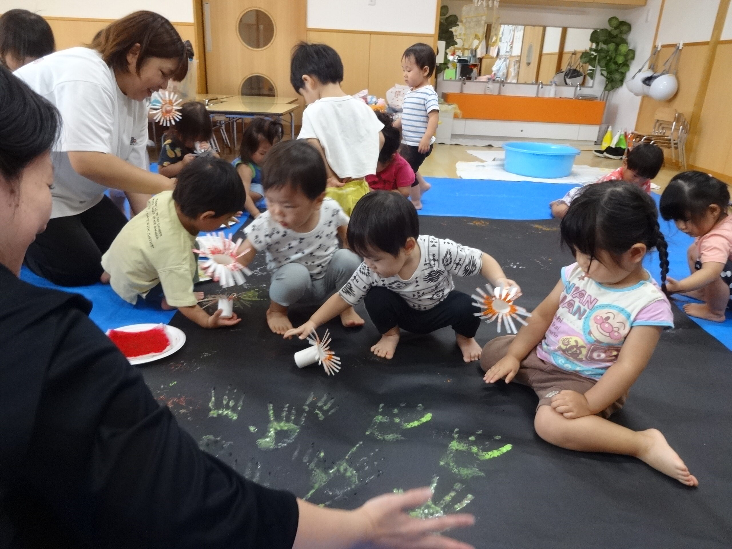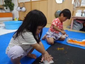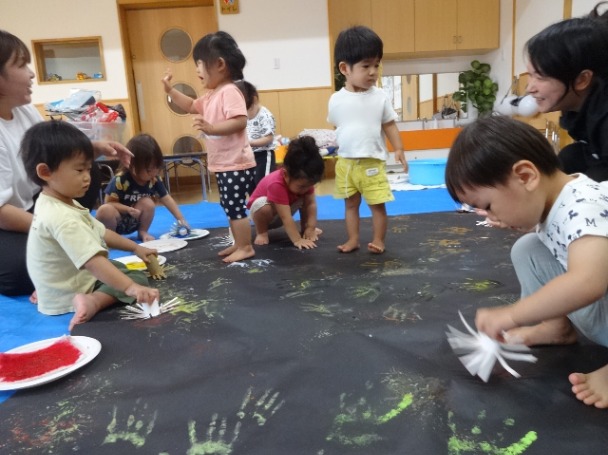 大きな黒色のとりのこ用紙に、絵の具を使って手形や花火スタンプで花火の制作をしました。初めは『おそるおそる…』といった様子の子ども達でしたが、慣れてくると汚れることも楽しみながら、色々な場所に手形を押したり、スタンプを押したりして、楽しんでいました。