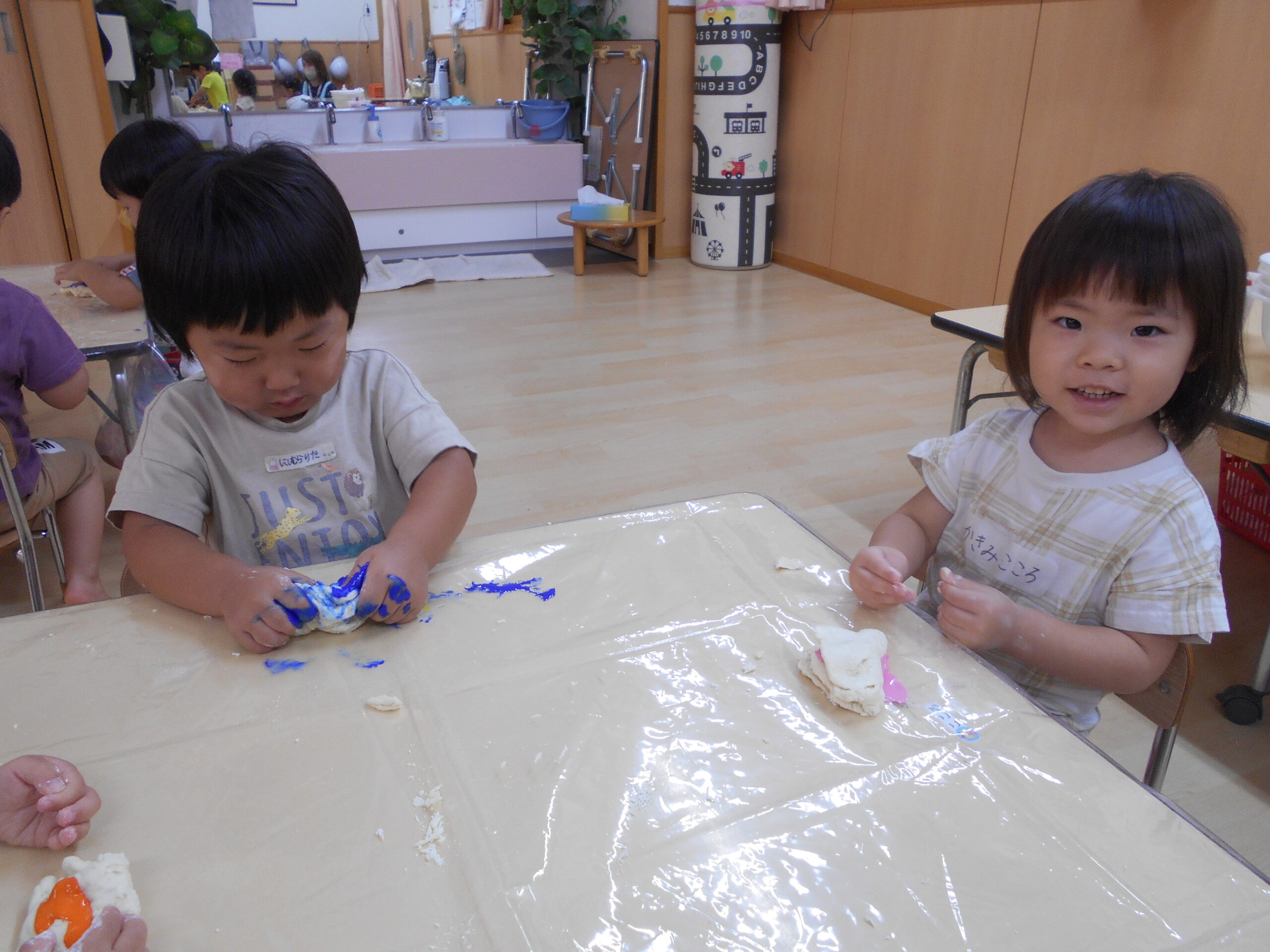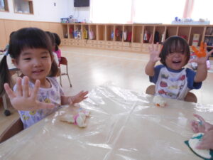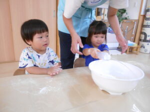粉に水を加えながら、粉・水・お団子・絵の具など、色々な感触を楽しむ事ができました。『コネコネ…』たくさん遊んだ後は、丸めてカップに入れて、アイスクリームの完成です。出来上がったアイスクリームを並べて『アイスクリームの歌』を歌うと、とても嬉しそうでした。