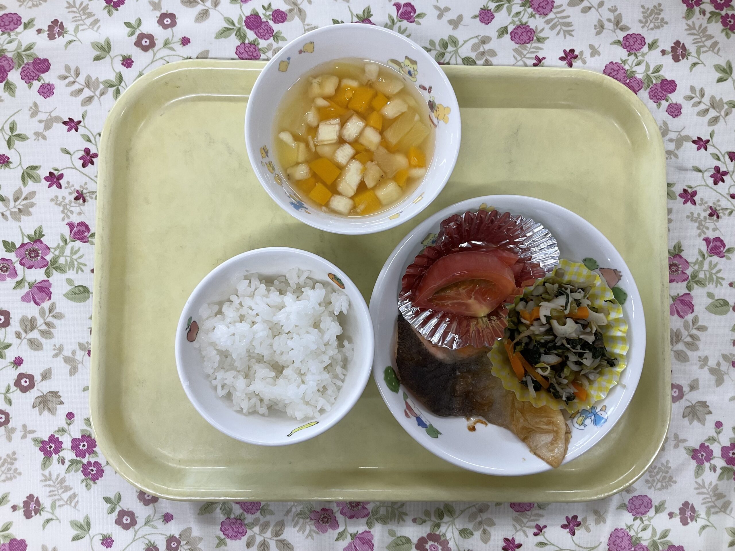 ごはん、さけのムニエル、青菜ときのこの酢物、トマト