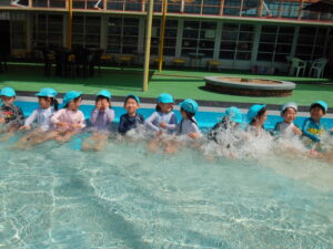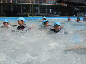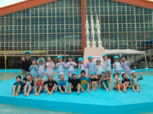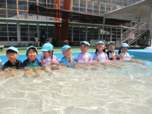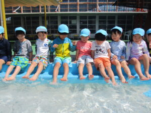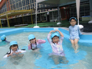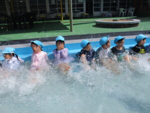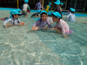 少しずつ冷たい水に体を慣らすために、足から順番に入って行き、水を掛け合ったりワニやカニに変身してプールの中を自由に歩いたりしました。保育園とは違う大きなプールで、笑顔いっぱい、大歓声で楽しんでいました。