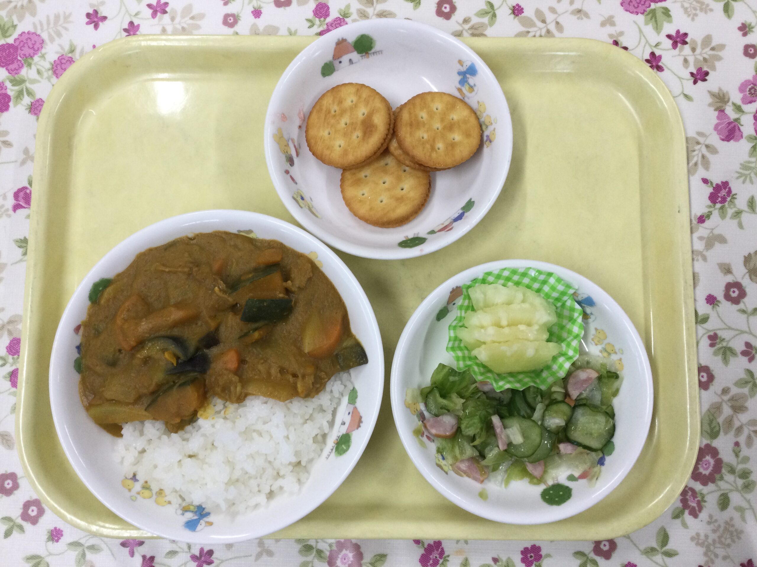 夏野菜カレー、レタスとウインナーのサラダ、パイン缶
