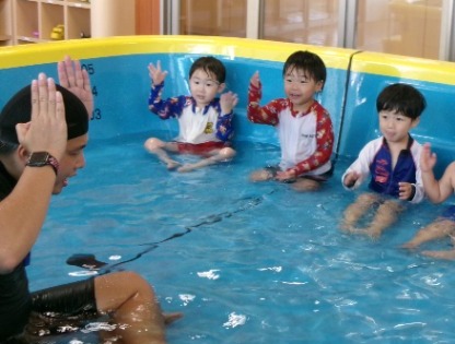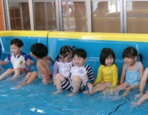 年少組から始まるプール遊び。「今日は大きいプールに入るよ!」と聞くと、大喜びでジャンプしたり「今日プールするんだって。」と友だちに伝える姿もあるほどです。プールでは、保育士の話をしっかりと聞きながら楽しみました。ワニ歩きをしたり、チームに分かれてバタ足競争をしたりしました。プール最終日には、体操教室の先生と一緒に楽しみ、顔を水につけることにも挑戦です。顔をつける時のコツを教えてもらってから水に入りました。「できたよ!見てて!」と見せてくれる子もいて、このひと夏でずいぶん水に慣れた様子です。