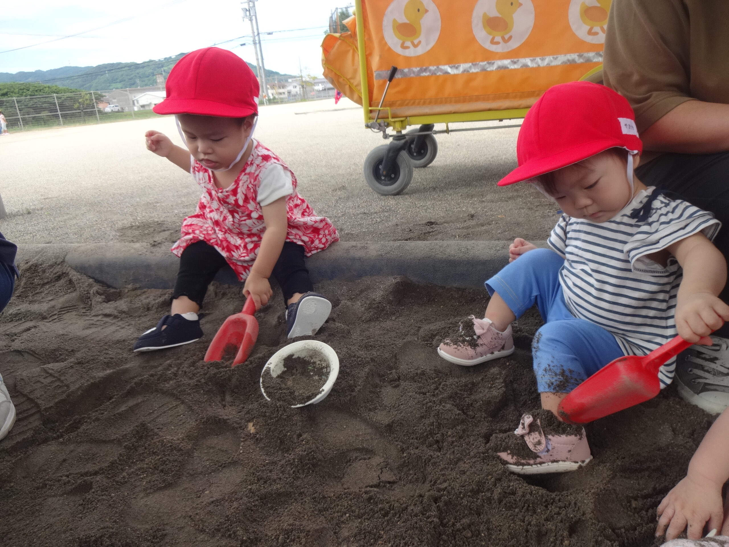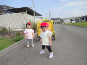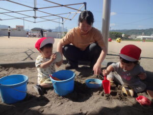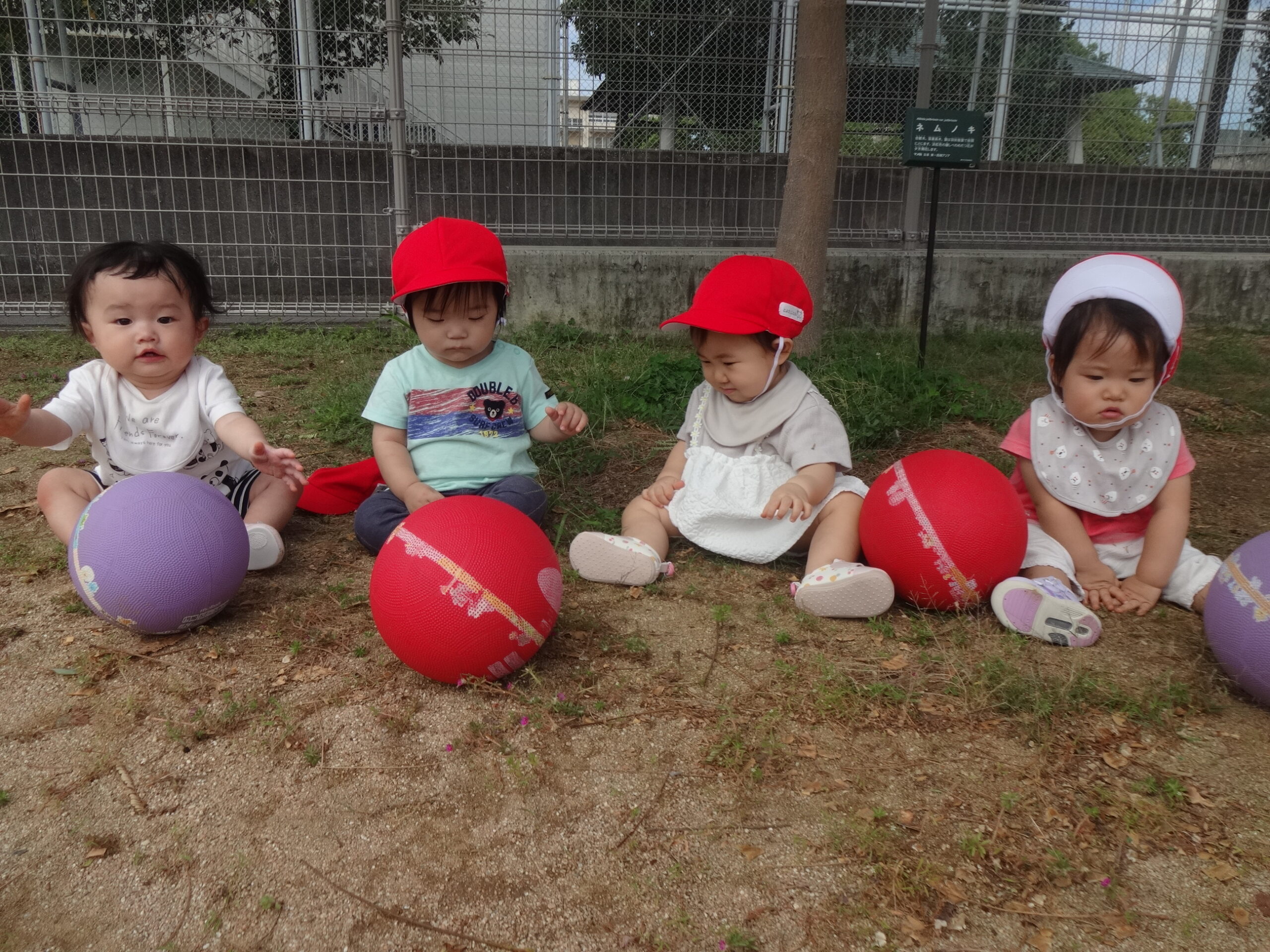 少しづつ過ごしやすい気候になり、園庭の砂場やボールで遊んだり、園周辺の散歩に出かけたりしました。秋の自然の中で歩いたり、葉っぱや草を触ったりしてのびのびと探索を楽しんでいます。色々な物に興味を持って、感触を楽しむのも好きな様子です。