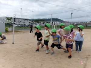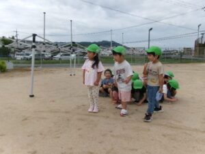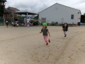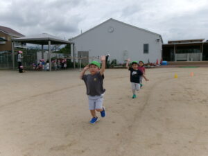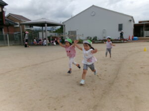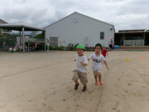 友だちと競争しながら走る事を楽しむ子ども達。『位置について、よーい。』のポーズもだいぶできるようになっています。「一番になった」と教えてくれたり「速かったね」と伝えると喜ぶ姿があるほど全力で走っています。楽しさを感じながら、自信を持って走れるようになってきたたんぽぽ組さんです。