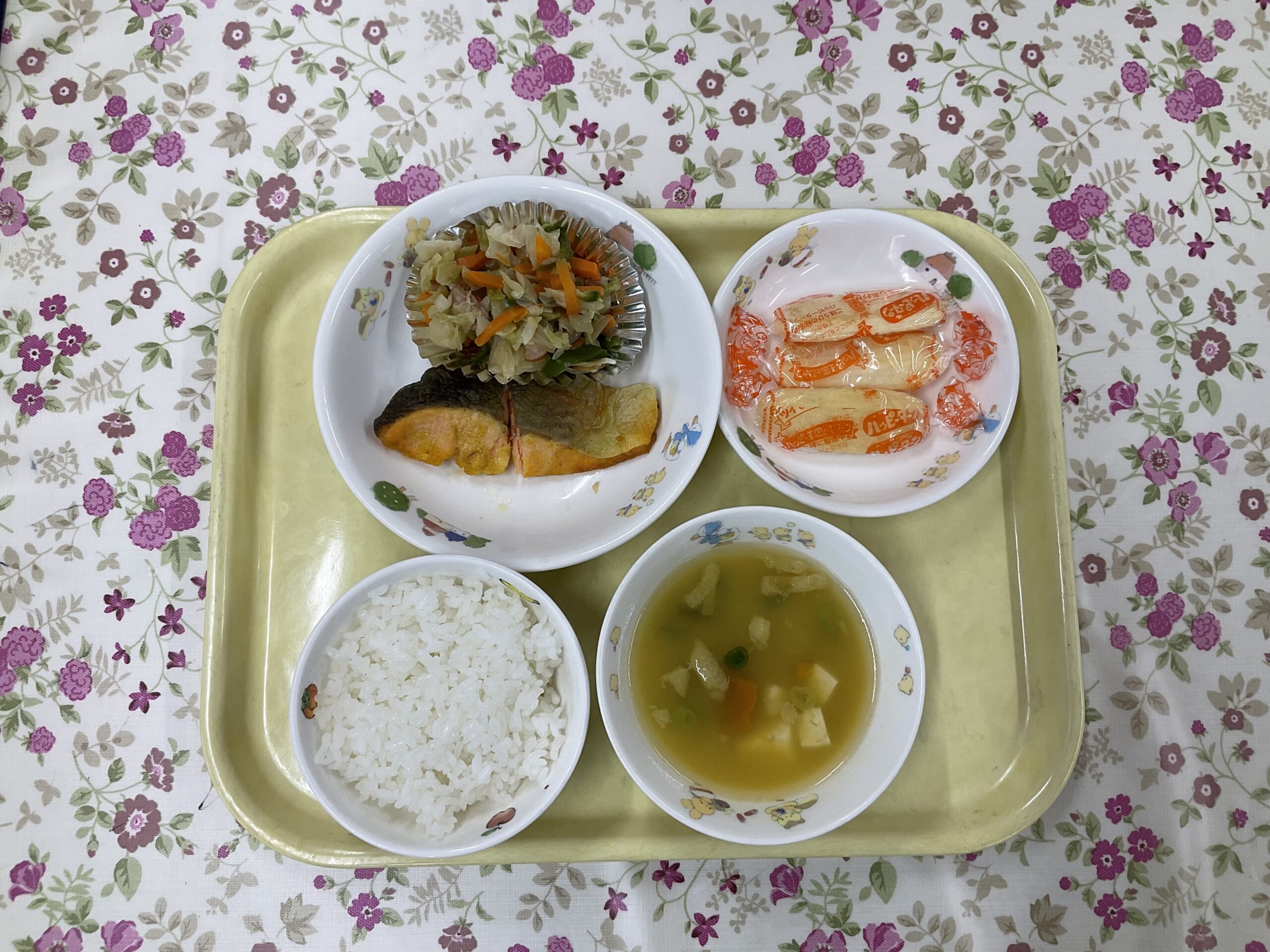 ごはん、さけのカレームニエル、野菜炒め、豆腐とかぼちゃのみそ汁