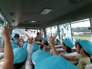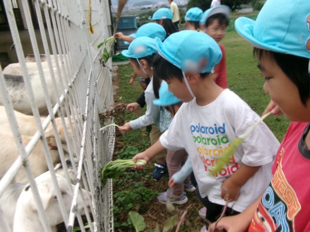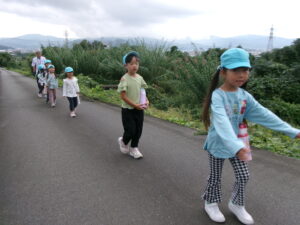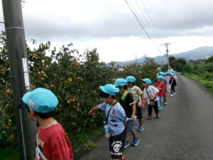 アルムの里へさつま芋掘りに行きました。バスの中でのクイズでは「さつま芋の葉はどんな形?」と聞くと、色々な答えが出て来たゆり組さん。「畑に行って自分で答えを確かめよう。」と伝えると、収穫の時には葉っぱの形をじっくりと確かめる姿もありました。畑に行く途中の道では柿の木を見つけて、秋を感じることができました。